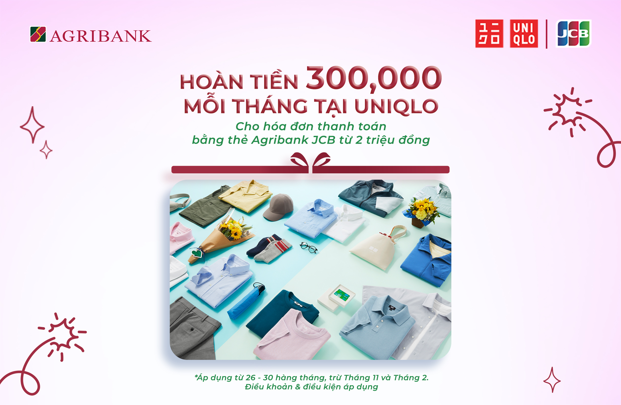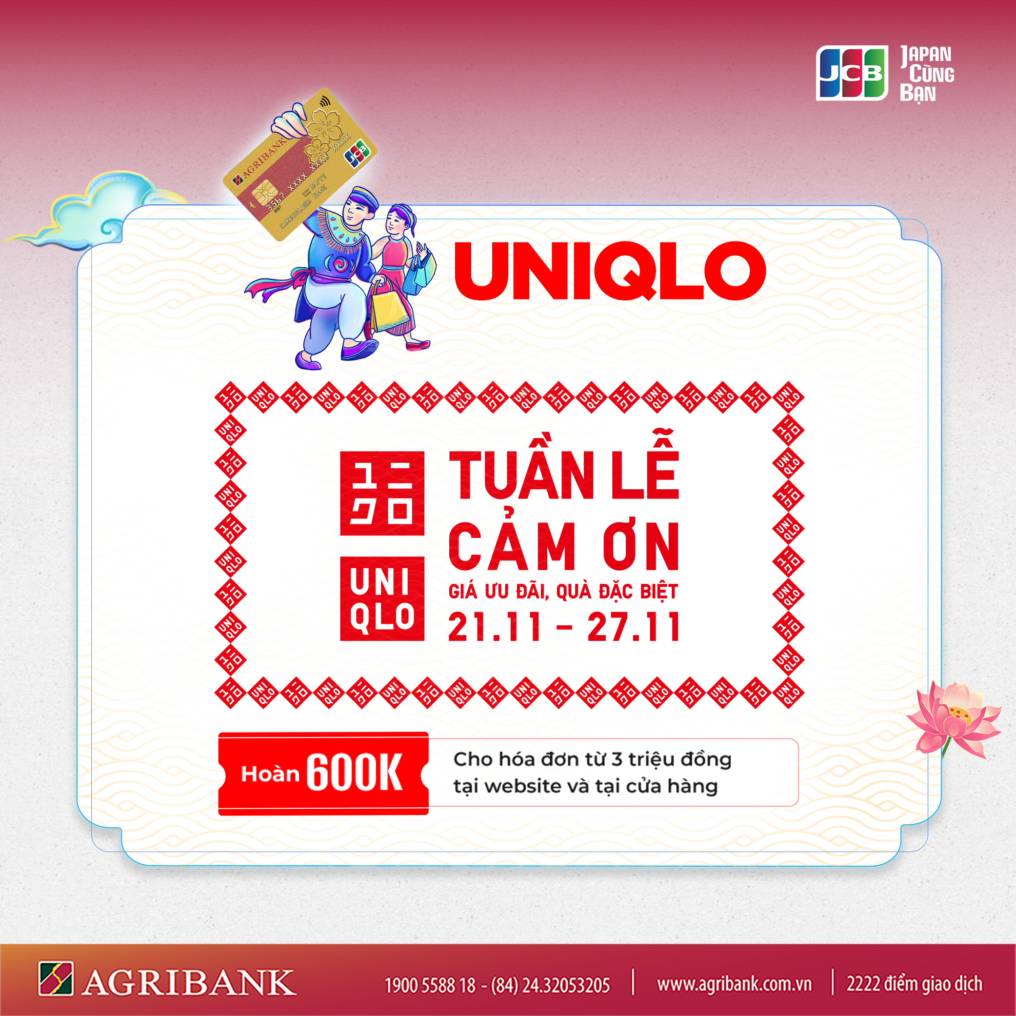 Trải nghiệm mua sắm phong cách cùng UNIQLO và tận hưởng những ưu đãi hoàn tiền hấp dẫn khi thanh toán bằng thẻ Agribank JCB.
