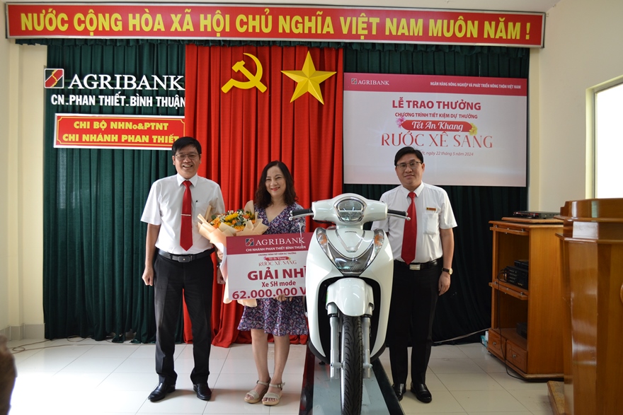 Agribank tổ chức chương trình tiết kiệm dự thưởng “Tết an khang - Rước xế sang” từ ngày 20/12/2023 đến hết ngày 20/4/2024, chương trình có 3.925 giải thưởng với tổng trị giá trên 18 tỷ đồng. Kết thúc chương trình, sau khi quay số mở thưởng, tại Agribank chi nhánh Bình Thuận có 56 khách hàng trúng giải, bao gồm: 01 giải Nhì, 4 giải Ba và 51 giải khuyến khích. Giải Nhì là chiếc xe máy SH Mode trị giá 62 triệu đồng; giải Ba là sổ tiết kiệm VNĐ trị giá 10 triệu đồng; giải Khuyến khích là 01 triệu đồng.