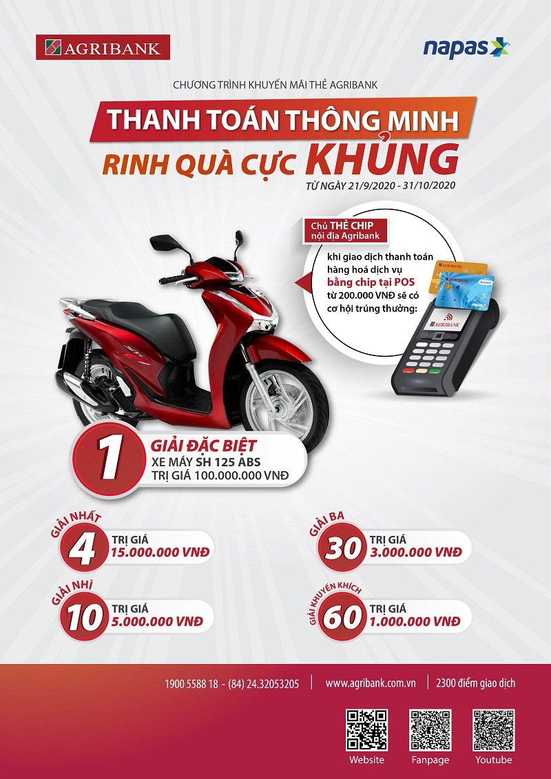 Chương trình khuyến mại “Thanh toán thông minh – Rinh quà cực khủng” được Agribank triển khai từ ngày 21/09/2020 đến hết ngày 31/10/2020 dành cho các khách hàng là chủ thẻ chip nội địa Agribank. Cụ thể: