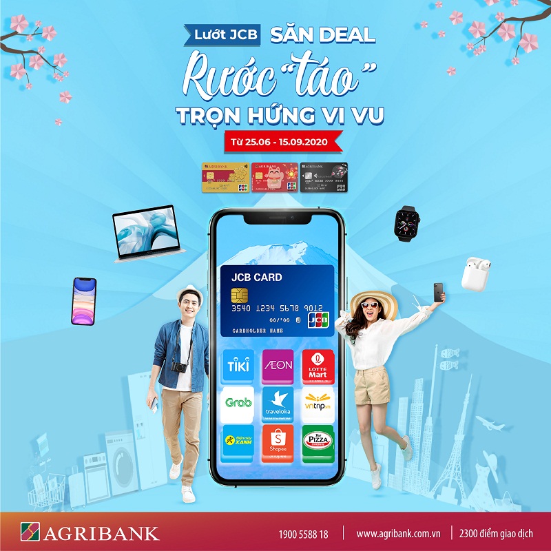 Với mong muốn mang đến cho chủ thẻ Agribank nhiều cơ hội để trải nghiệm những công nghệ và tiện ích mới từ thẻ quốc tế JCB, từ ngày 25/06/2020 đến hết ngày 15/09/2020, Agribank triển khai chương trình khuyến mại “Lướt JCB, săn deal, rước “táo” trọn hứng vi vu” dành cho chủ thẻ Agribank JCB với nhiều ưu đãi hấp dẫn.