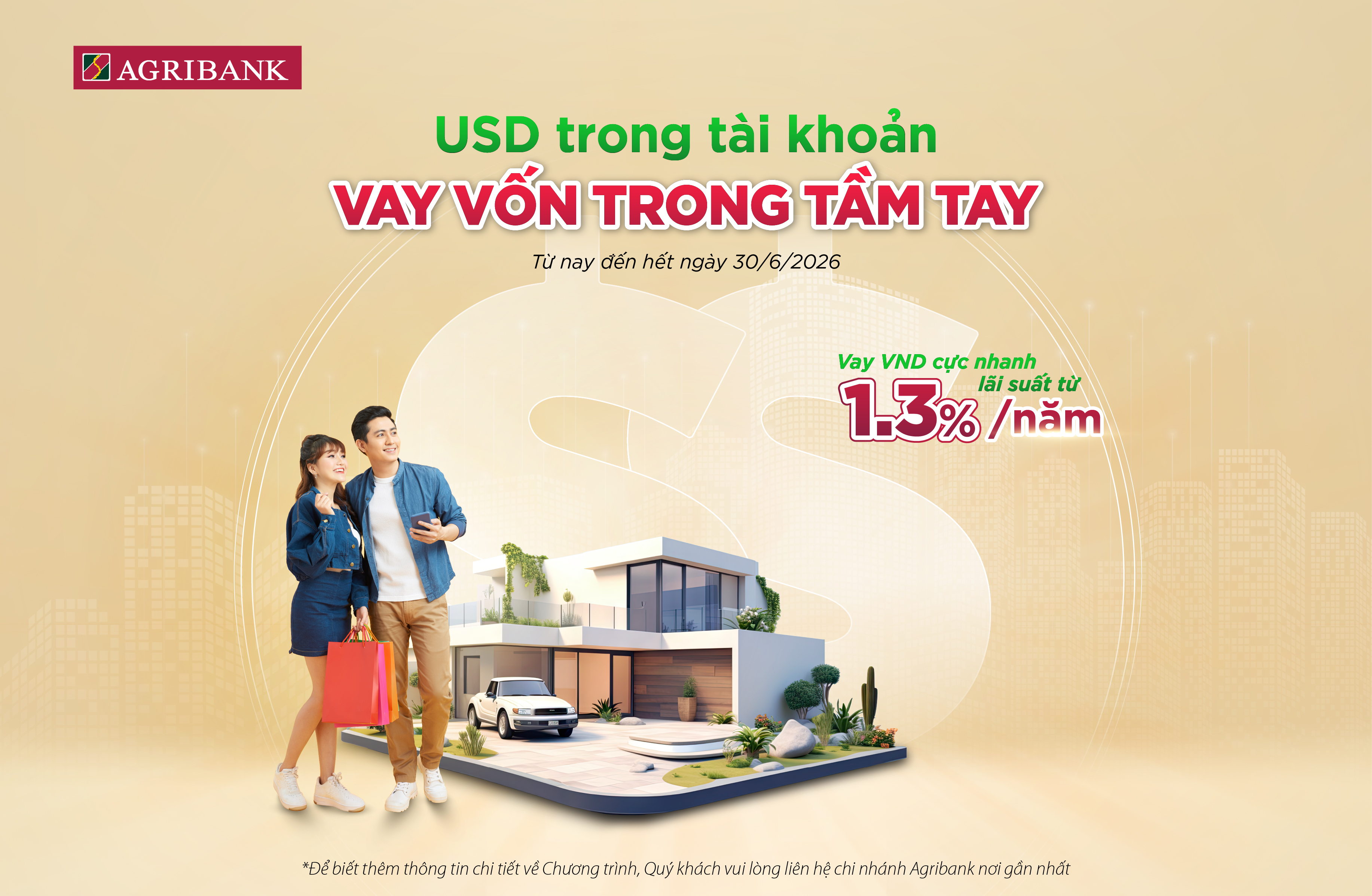 Nhằm hỗ trợ khách hàng cá nhân có tiền gửi USD tại Agribank tiếp cận nguồn vốn VND nhanh chóng, Agribank triển khai chương trình “USD trong tài khoản - Vay vốn trong tầm tay” quy mô khoảng 10.000 tỷ đồng, lãi suất từ 1,3%/năm, cụ thể: