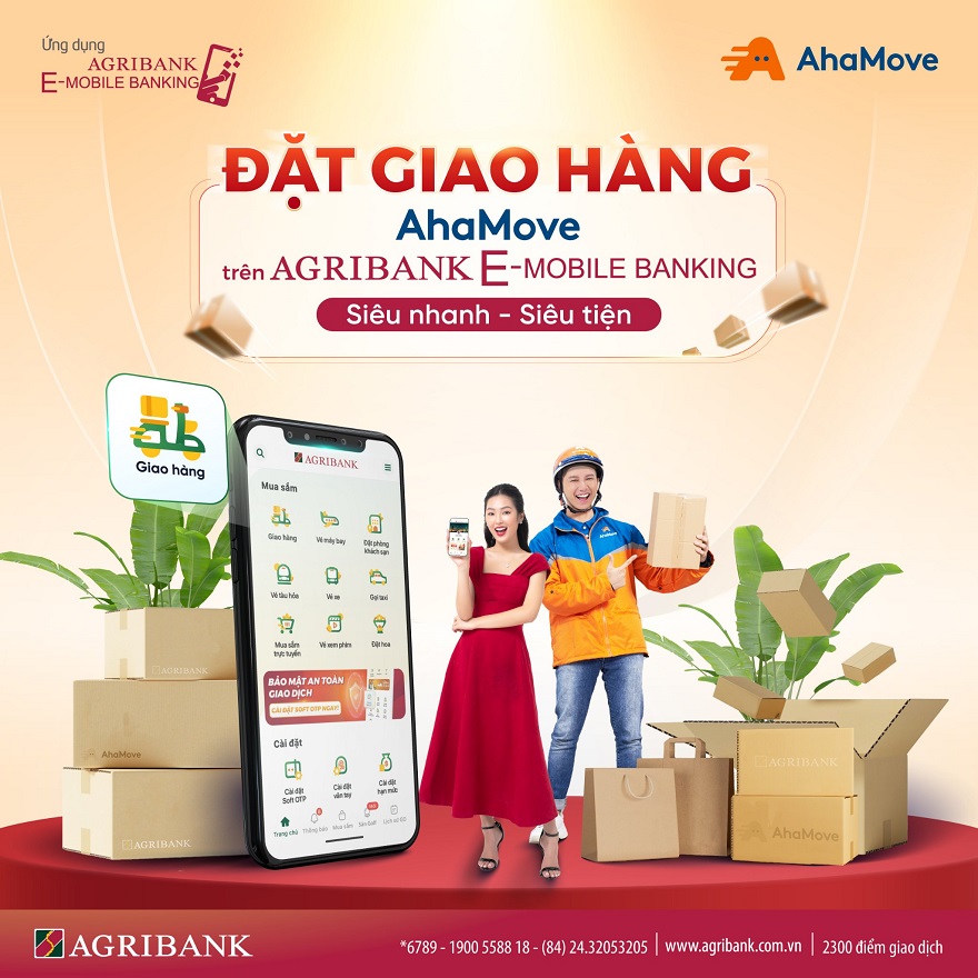Hợp tác cùng AhaMove - Thương hiệu uy tín về dịch vụ giao - nhận tại Việt Nam với hơn 7 năm kinh nghiệm; giờ đây, khách hàng của Agribank E-Mobile Banking đã có thể nhanh chóng kết nối với shipper và lựa chọn 4 hình thức giao hàng là: