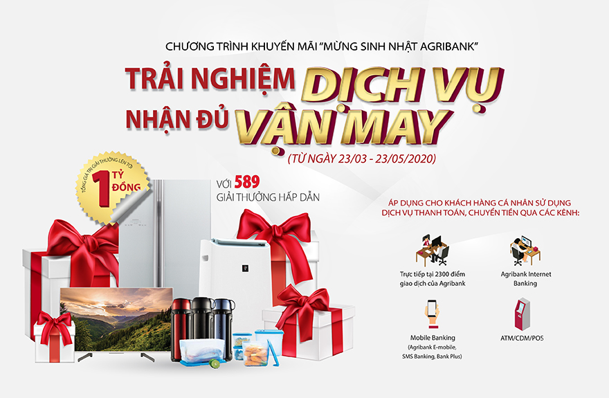Để tri ân hàng triệu khách hàng luôn đồng hành, tin tưởng đã và đang sử dụng các sản phẩm dịch vụ của Agribank, nhân dịp kỷ niệm 32 năm thành lập Agribank (26/03/1988- 26/03/2020), Agribank triển khai chương trình khuyến mại mừng sinh nhật Agribank với 589 Giải thưởng, tổng giá trị lên tới 01 Tỷ đồng.