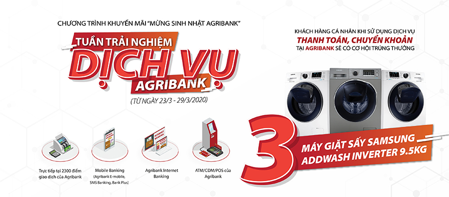 Đặc biệt, trong tuần sinh nhật tuổi 32 của Agribank từ ngày 23/03/2020 đến hết 29/03/2020, khi khách hàng thực hiện các giao dịch chuyển tiền, thanh toán tại các kênh như trên, sẽ được tham gia ngay chương trình quay số của Tuần sinh nhật Agribank, dự kiến tổ chức vào ngày 05/4/2020 để có cơ hội trúng 03 Giải thưởng Sinh nhật, mỗi giải là Máy giặt sấy Samsung AddWash Inverter 9.5 kg WD95K5410OX/SV trị giá gần 20 triệu đồng. Đồng thời, với các mã dự thưởng tuần, khách hàng vẫn tiếp tục được tham gia quay số may mắn cuối chương trình với hơn 500 Giải thưởng giá trị.