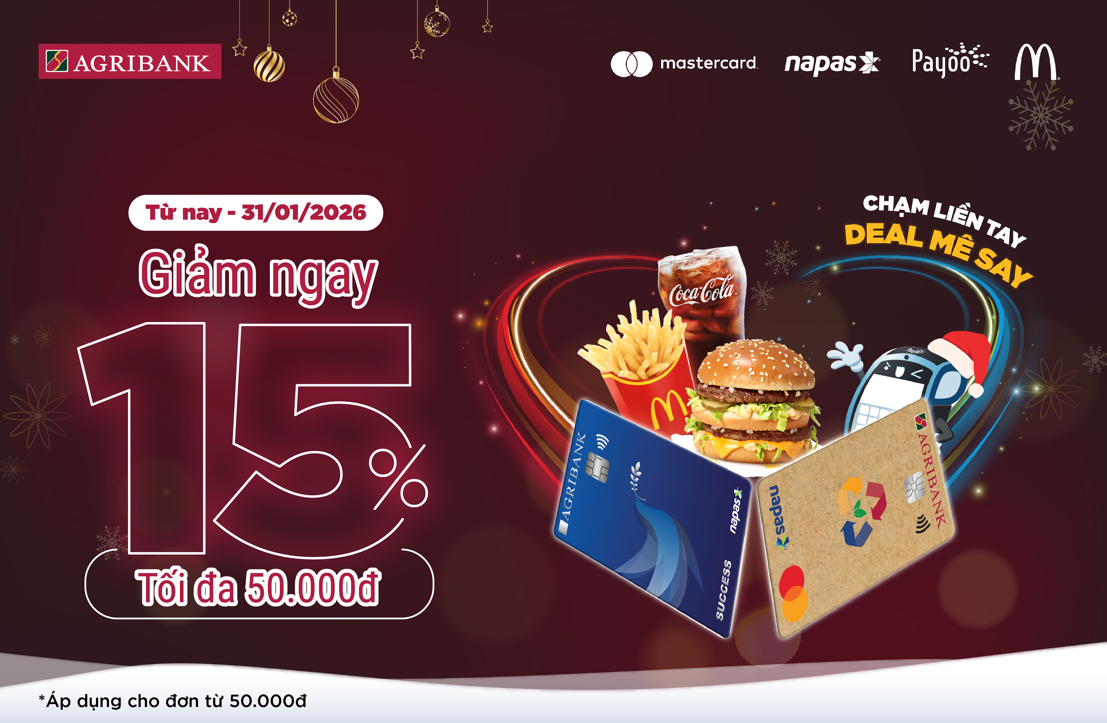 Từ siêu thị, cửa hàng tiện lợi đến những thức uống yêu thích, Agribank gửi tới Quý khách loạt chương trình ưu đãi hấp dẫn mùa Giáng sinh tại nhiều thương hiệu quen thuộc trên toàn quốc. Với thao tác thanh toán chạm nhanh gọn và an toàn, Quý khách dễ dàng nhận ưu đãi trong từng giao dịch hằng ngày - dù là mua sắm nhu yếu phẩm, thưởng thức đồ uống hay chọn lựa sản phẩm công nghệ để mùa lễ thêm trọn vẹn.