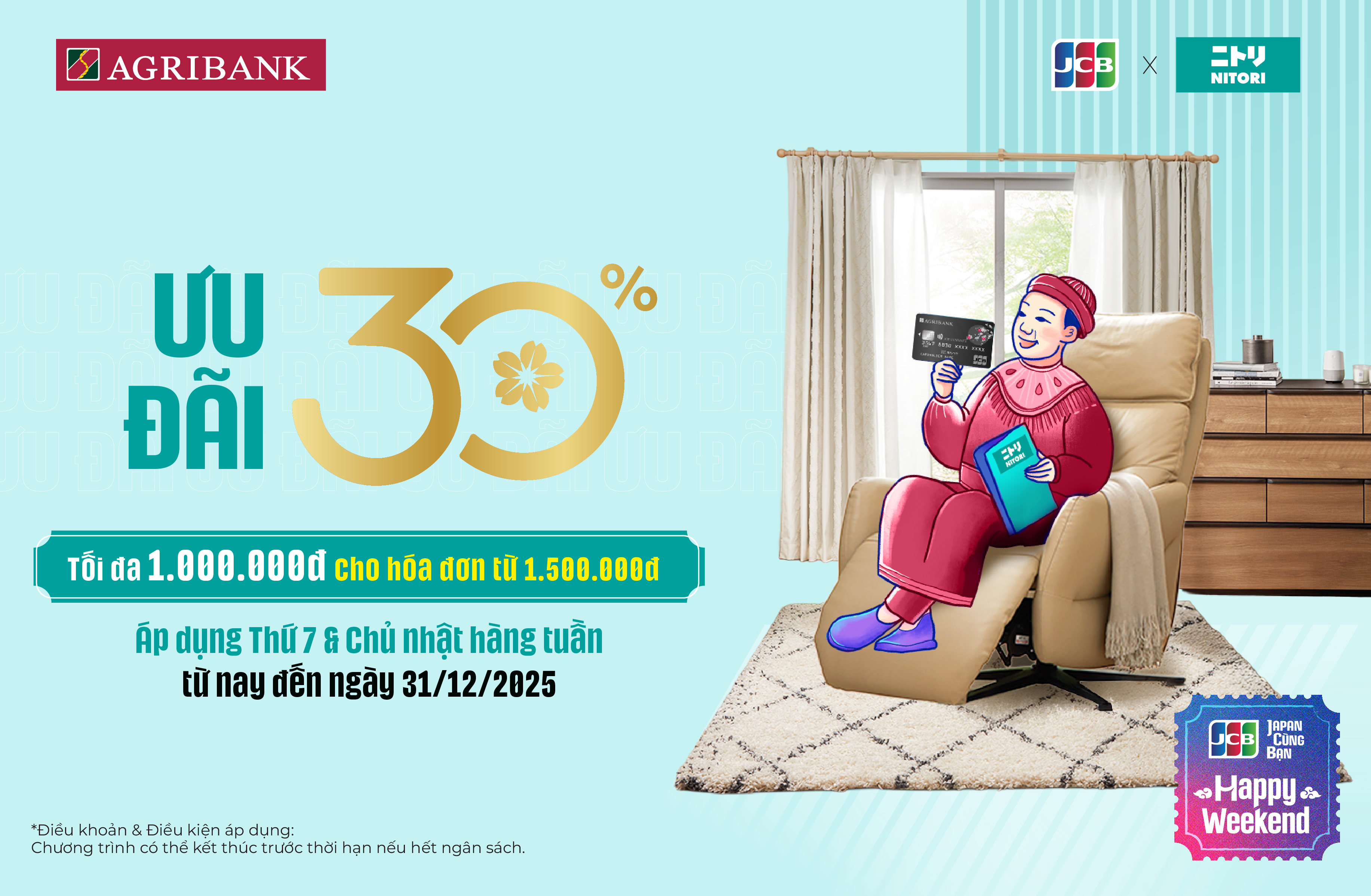 Nội dung khuyến mại: Ưu đãi 30% tối đa 1.000.000đ cho hóa đơn từ 1.500.000đ khi thanh toán bằng thẻ Agribank JCB.