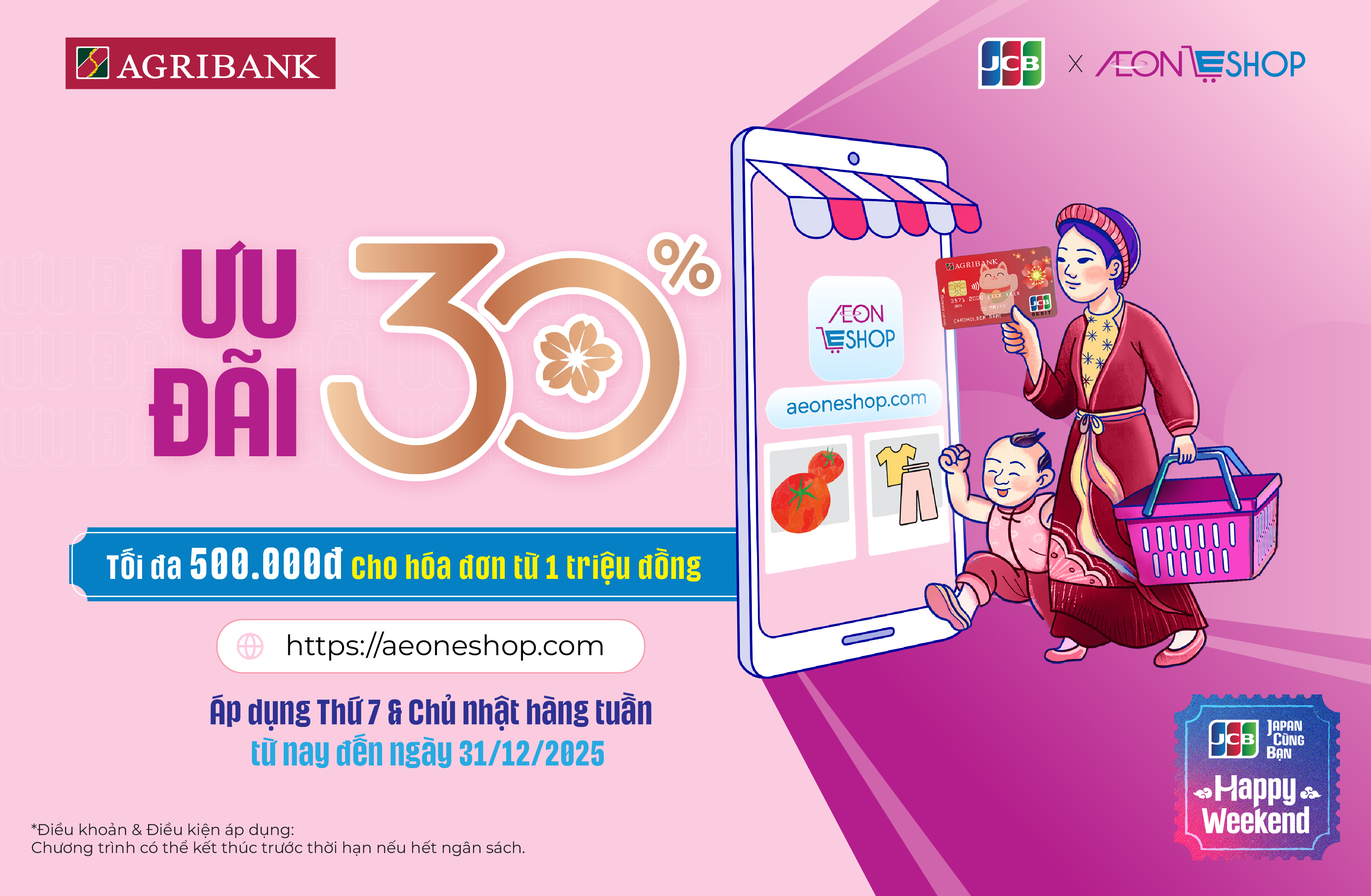 Nội dung khuyến mại: Ưu đãi 30% tối đa 500.000đ cho hóa đơn từ 1.000.000đ khi thanh toán bằng thẻ Agribank JCB qua cổng thanh toán Payoo trên trang https://aeoneshop.com hoặc ứng dụng AEON eShop.