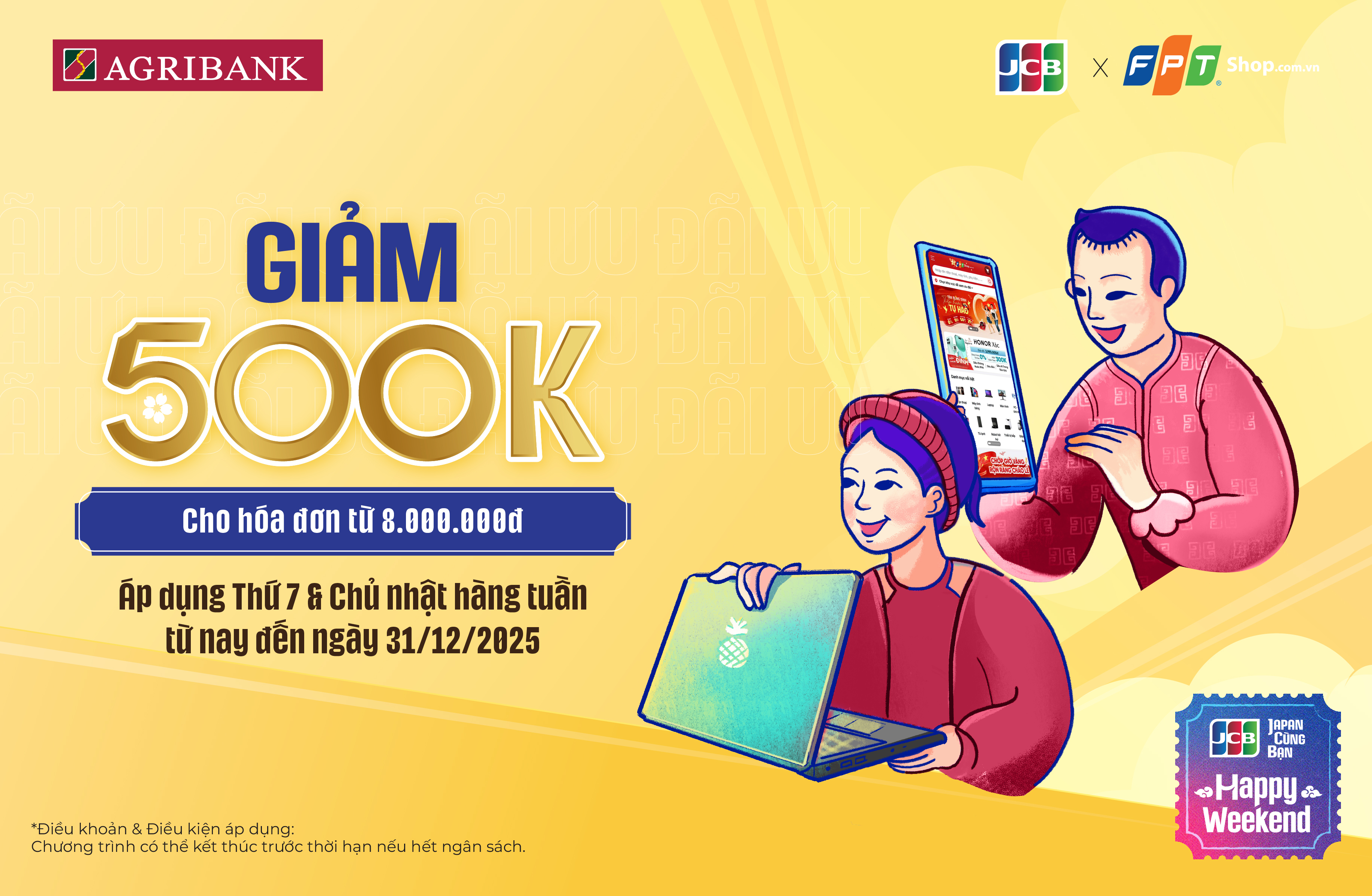 Nội dung khuyến mại: Ưu đãi 500.000đ áp dụng cho đơn hàng từ 8.000.000đ khi thanh toán bằng thẻ Agribank JCB.