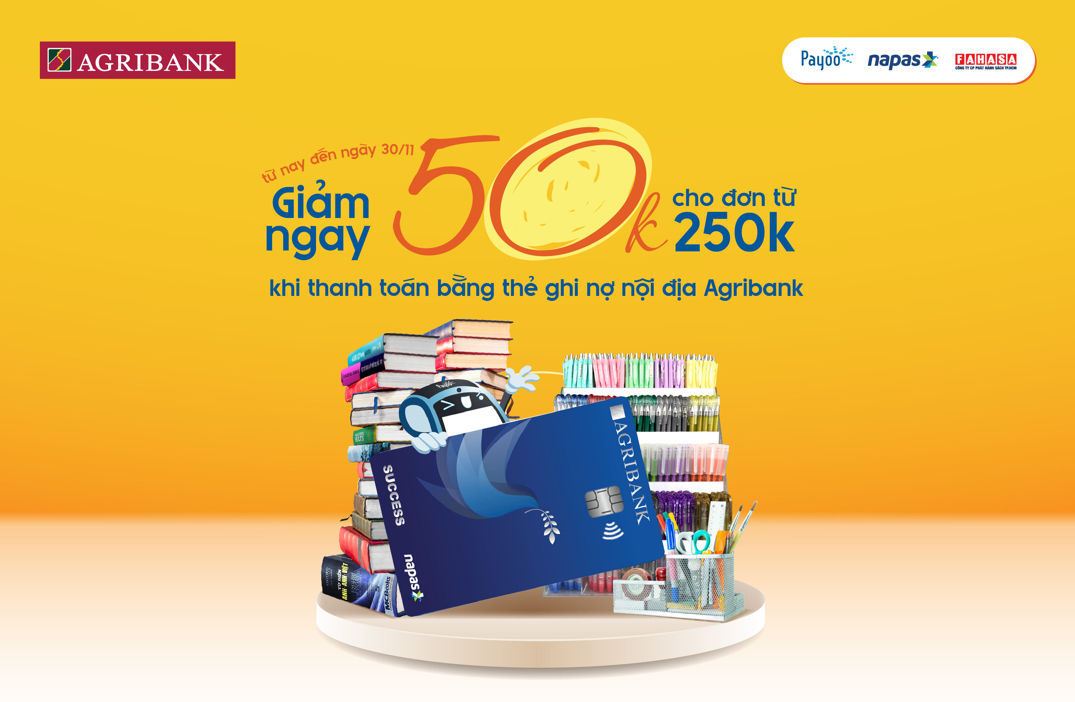 Nội dung khuyến mại: Giảm ngay 50.000đ cho đơn hàng từ 250.000đ khi thanh toán bằng thẻ Nội địa Agribank qua Payoo POS tại hệ thống nhà sách Fahasa toàn quốc.