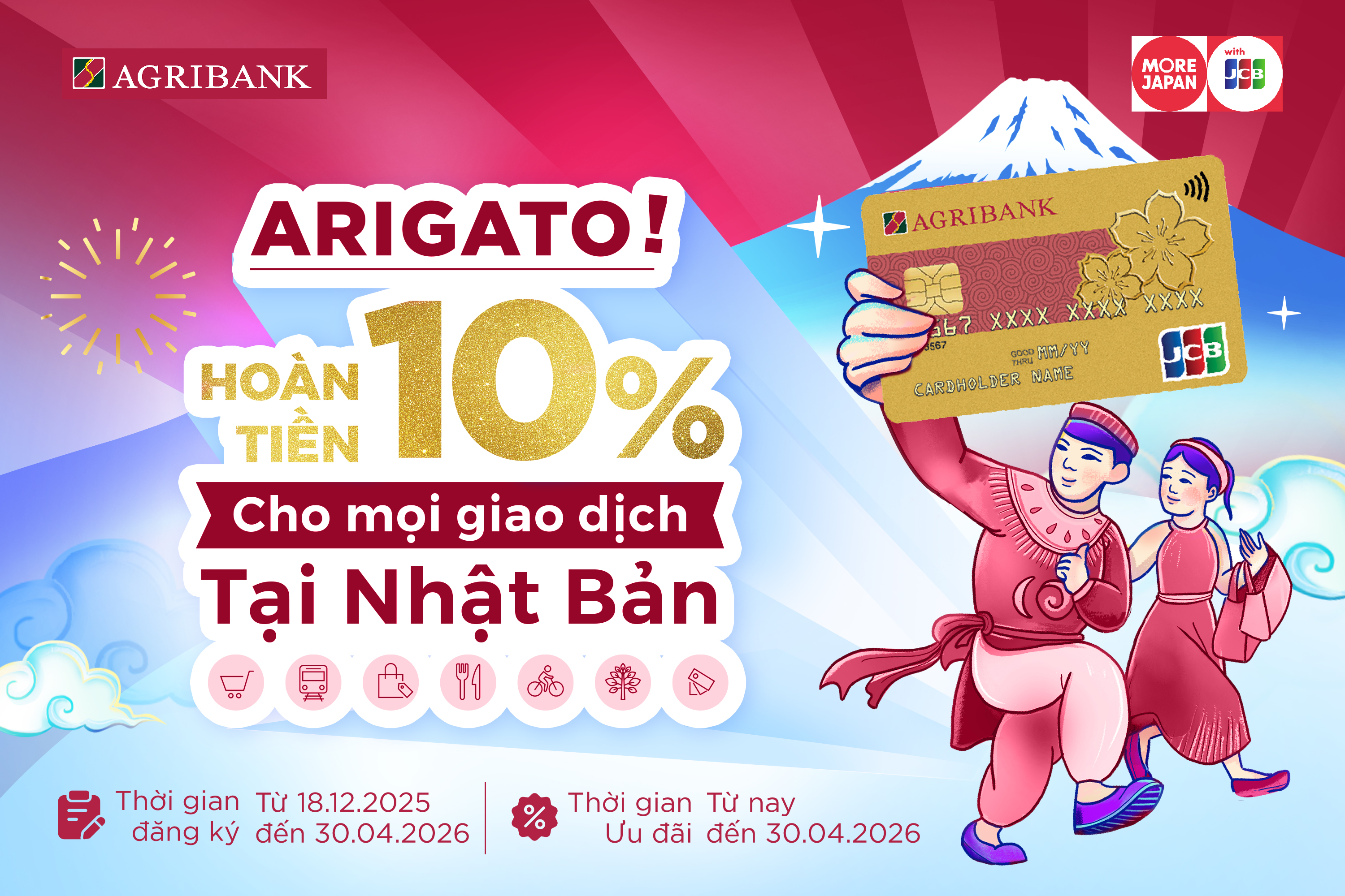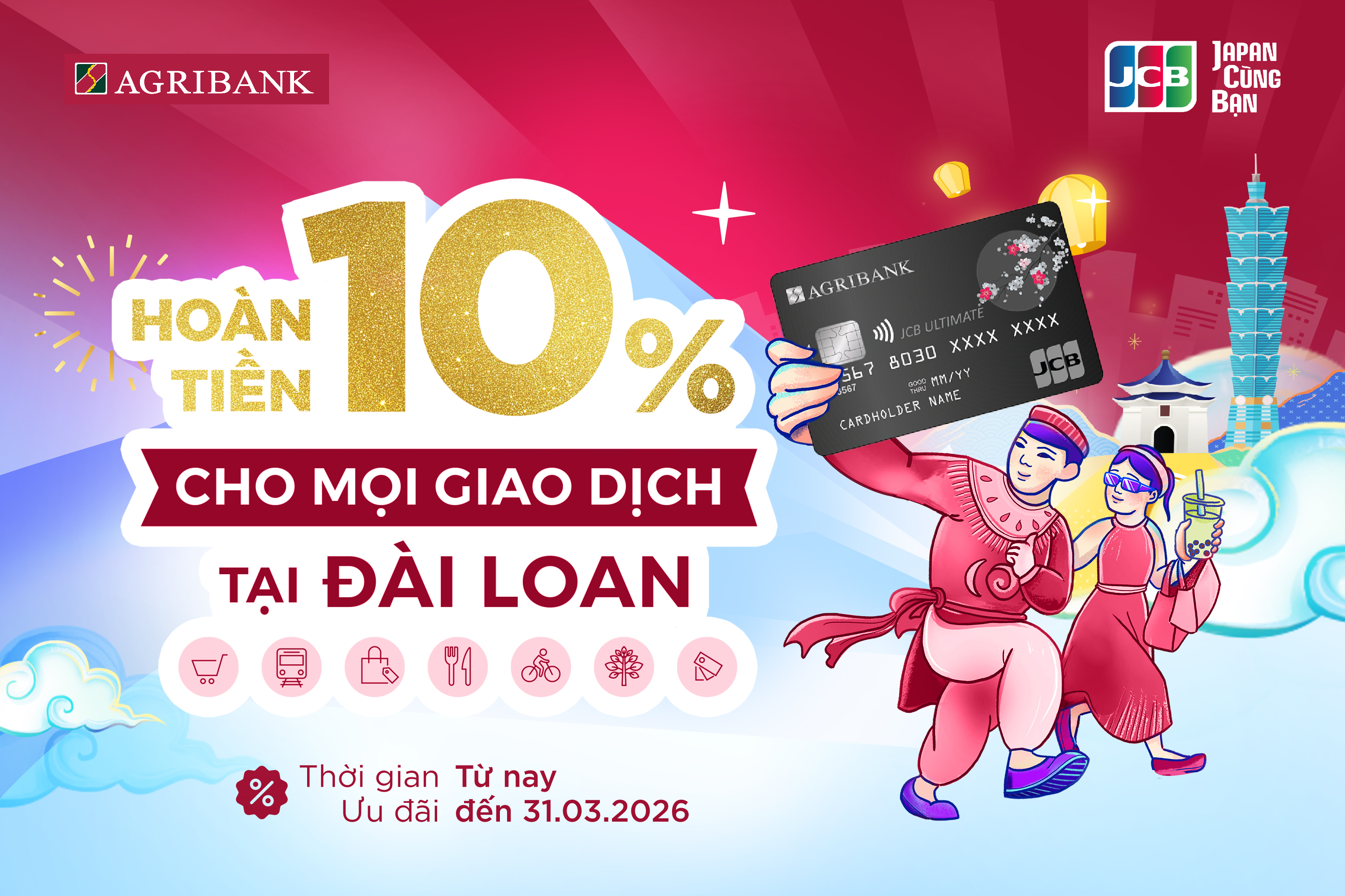 Khám phá từ những con phố sôi động rực rỡ sắc màu của Bangkok, những góc nhỏ yên bình mang đậm nét văn hóa tại Đài Bắc, cho đến mùa hoa anh đào lãng mạn trải dài khắp Nhật Bản. Mỗi hành trình đều mang đến những trải nghiệm khó quên. Đặc biệt, chuyến đi ấy sẽ càng trở nên đáng giá hơn khi bạn thanh toán bằng thẻ Agribank JCB để nhận hoàn tiền lên tới 10% cho các giao dịch chi tiêu quốc tế.