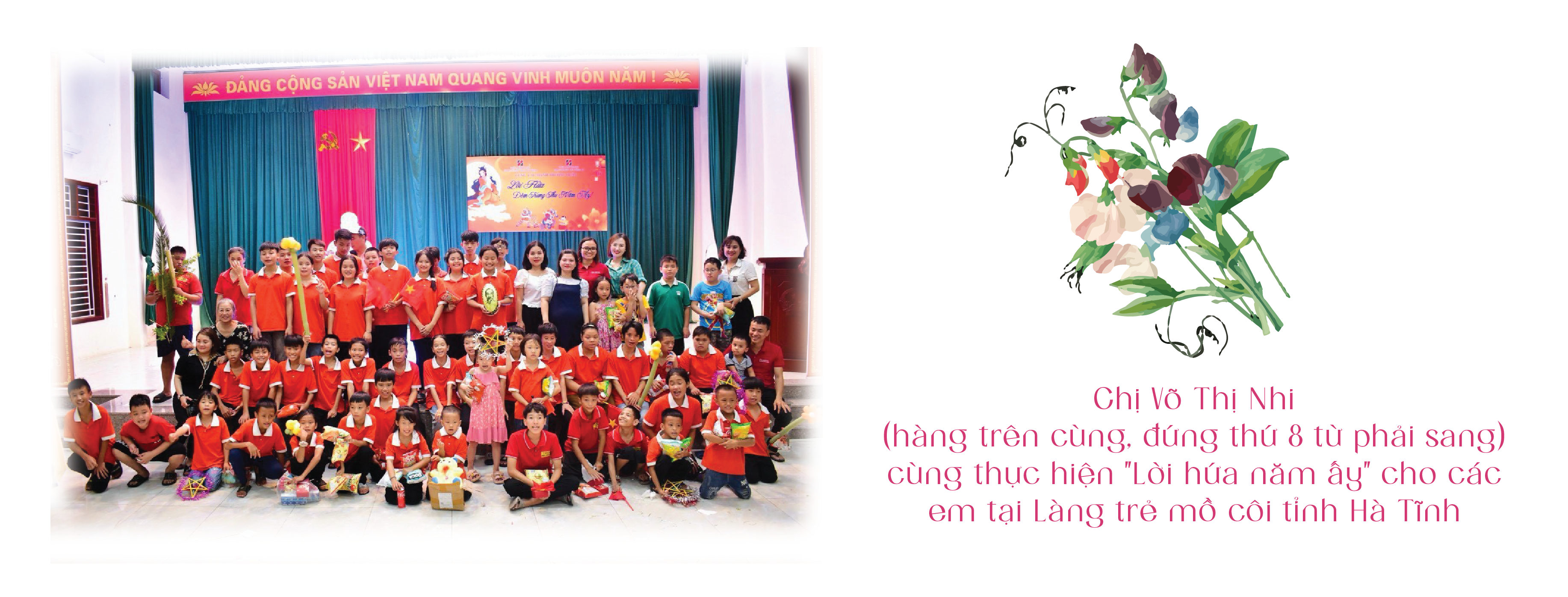 Năm vừa qua chị Nhi phối hợp cùng đơn vị công tác và mạnh thường quân tiến hành quyên góp được từ các cá nhân và tổ chức kinh phí hơn 52 triệu đồng để tổ chức một chương trình trung thu vui vẻ và ấm áp cho các em nhỏ tại Làng trẻ em mồ côi Hà Tĩnh. Trước đó, chị cũng đã quyên góp được số tiền trên 55 triệu đồng cùng nhiều hiện vật khác để hỗ trợ người dân vùng lũ các huyện Cẩm Xuyên, Can Lộc, Thạch Hà. Mới đây nhất, thấy cụ Nguyễn Thị Dự (Sinh năm 1949, trú tại Thạch Hội, Thạch Hà) vì hoàn cảnh khó khăn, neo đơn sống một mình trong căn nhà không có điện, chị Nhi tiếp tục kêu gọi lắp điện chiếu sáng giúp đỡ cụ bà... Những hoạt động đó, đối với chị Nhi “không chỉ là giúp đỡ người khác mà còn là giúp bản thân mình sống tử tế và hạnh phúc hơn!”.