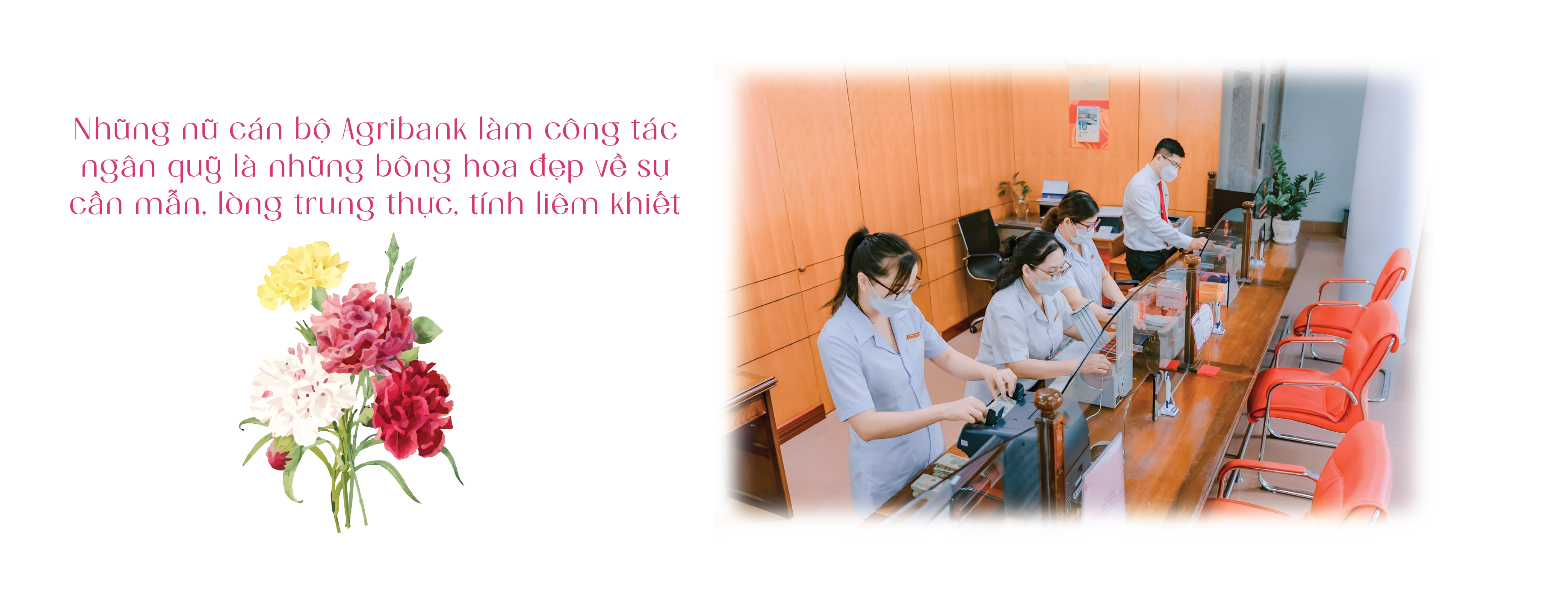 Ngành Ngân hàng còn có lực lượng lao động rất đặc thù, đó là những cán bộ làm công tác ngân quỹ. Với vị trí này, các chị không chỉ tuân thủ đúng chế độ tiền tệ, kho quỹ, đảm bảo an toàn, mà còn là những bông hoa đẹp về lòng trung thực, tính liêm khiết. Nhiều tấm gương nữ đoàn viên, người lao động Agribank phát hiện nhầm lẫn trong quá trình giao dịch và trả lại tiền thừa cho khách hàng với số lượng lớn như chị Trần Thị Kim Oanh (chi nhánh Sài Gòn) trả lại 211 món, số tiền 856 triệu đồng; chị Phương Thị Phi Yến (chi nhánh tỉnh Tây Ninh) trả lại 500 triệu đồng/01 món; chị Nguyễn Thị Phương Lan (chi nhánh tỉnh Hải Dương) trả lại 364 món, số tiền 446 triệu đồng; chị Phạm Minh Phương (chi nhánh tỉnh Cao Bằng) trả lại 340 triệu đồng/01 món và nhiều tấm gương khác với tổng số tiền trả lại trong năm 2023 là hơn 78,5 tỷ đồng.