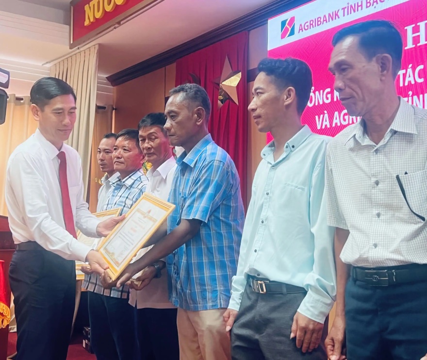 Ông Ngô Vũ Thăng - Phó Chủ tịch UBND tỉnh Bạc Liêu (bìa phải) và ông Phan Văn Bá - Phó Trưởng Văn phòng Đại diện Agribank Khu vực Tây Nam Bộ (bìa trái) trao bằng khen cho các tổ trưởng tổ nông dân.