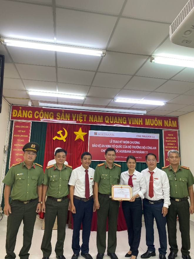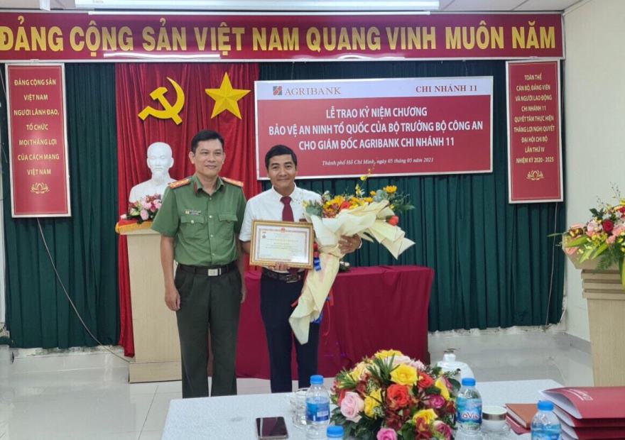 Sáng 05/05/2021 vừa qua, tại Trụ sở Agribank Chi nhánh 11, Công an TP.Hồ Chí Minh thừa ủy quyền của bộ trưởng Bộ Công an tổ chức Lễ trao tặng giấy khen cho Agribank Chi nhánh 11 ‘’Đã có thành tích xuất sắc trong phong trào toàn dân bảo vệ ANTQ’’ và kỷ niệm chương ‘’Bảo vệ ANTQ’’ cho ông Nguyễn Anh Tuấn– Giám đốc Chi nhánh 11.