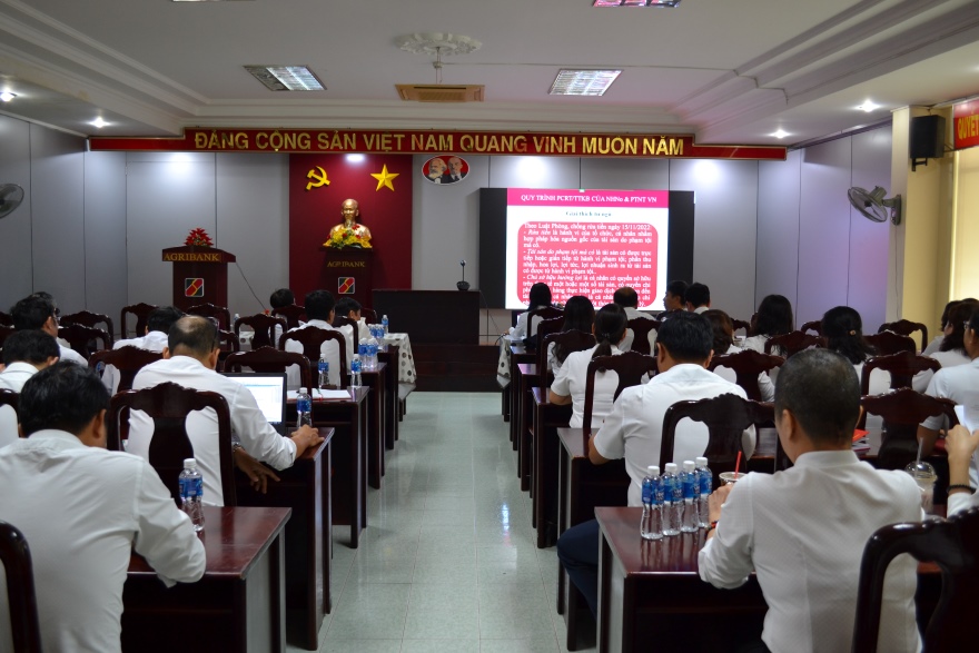 Tại Hội nghị, báo cáo viên trình bày các văn bản về phòng chống rửa tiền như: Quy chế 876/QĐ-HĐTV-KTNB ngày 31/12/2020, Quy trình 1939/QTr-NHNo-KTNB ngày 31/8/2022, Thông tư 09/2023/TT-NHNN ngày 28/7/2023, văn bản 5192/NHNo-KTNB ngày 16/5/2023 và các công văn triển khai của Agribank chi nhánh Bình Thuận. Quy định về xử phạt vi phạm hành chính trong lĩnh vực tiền tệ và ngân hàng theo Nghị định 88/2019/NĐ-CP ngày 14/11/2019 và Nghị định sửa đổi số 143/2021/NĐ-CP ngày 31/12/2021 cũng được hướng dẫn cặn kẽ tại Hội nghị.