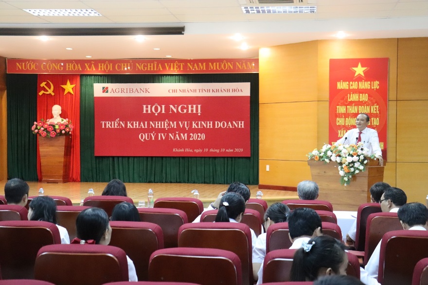 Sáng ngày 10/10/2020, Agribank Chi nhánh Khánh Hòa tổ chức Hội nghị sơ kết hoạt động kinh doanh 9 tháng đầu năm 2020 và triển khai nhiệm vụ kinh doanh quý IV năm 2020. Tham dự và chỉ đạo hội nghị có ông Lê Trực - Phó Trưởng Văn phòng Đại diện Agribank Khu vực miền Trung; Về phía Agribank chi nhánh Khánh Hòa có các đồng chí Ban Thường vụ Đảng ủy, Ban Giám đốc, lãnh đạo các phòng chuyên môn nghiệp vụ, Chủ tịch CĐCSTV, Bí thư Đoàn thanh niên; Giám đốc, Trưởng phòng nghiệp vụ và Giám đốc phòng giao dịch trực thuộc chi nhánh loại II thuộc Agribank Khánh Hòa.