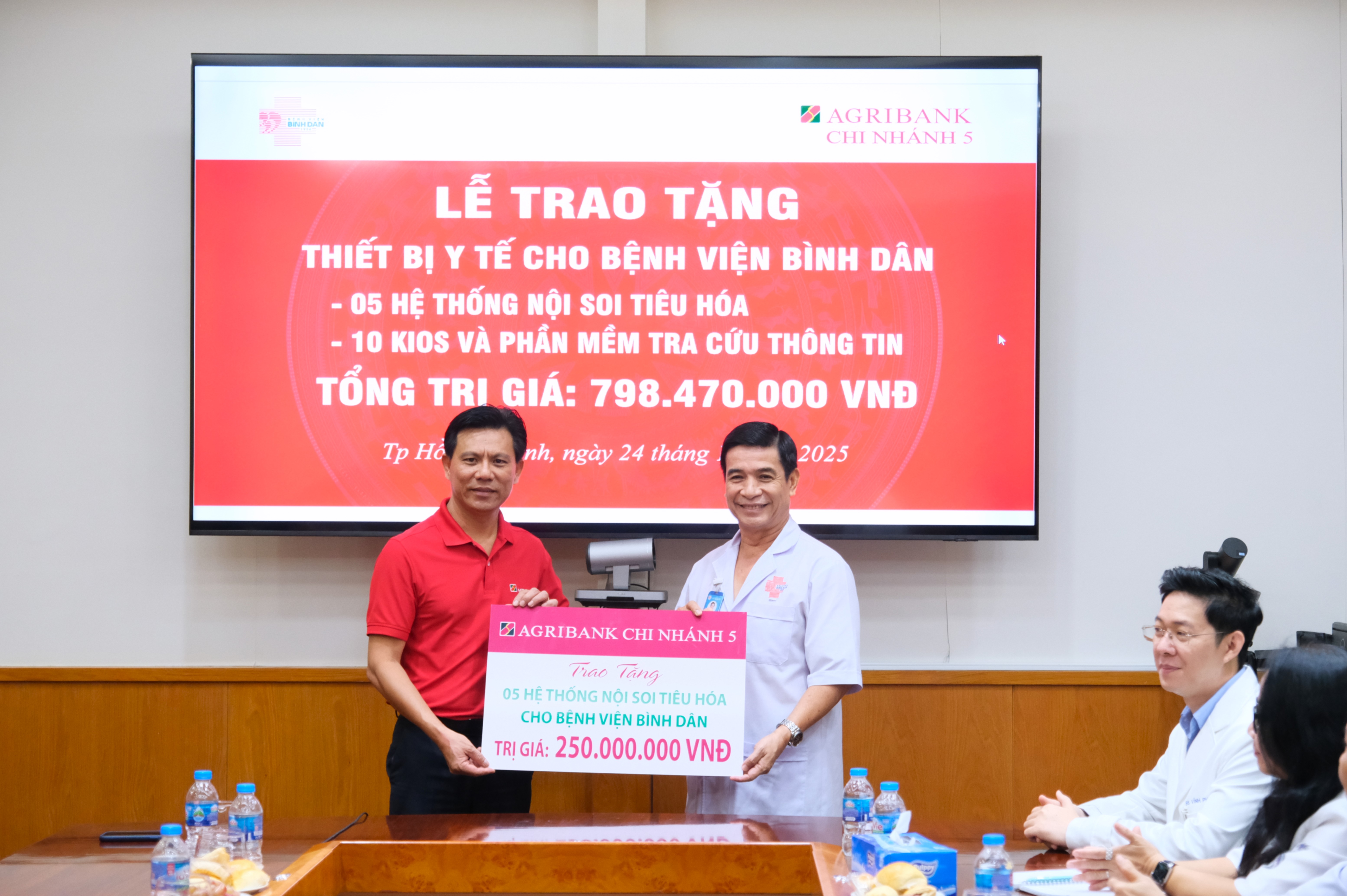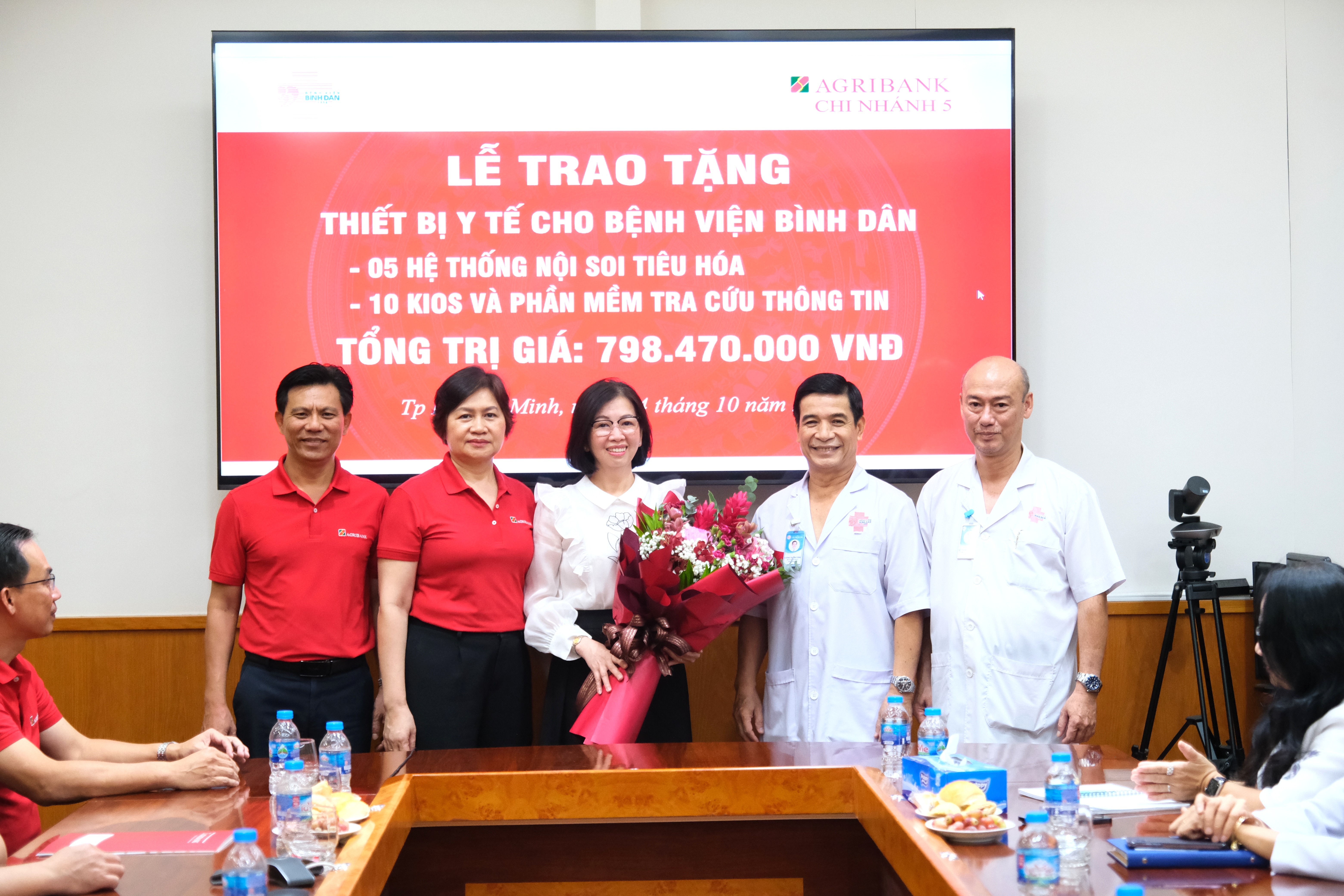 Riêng đối với Bệnh viện Bình Dân, Agribank Chi nhánh 5 luôn đồng hành trong hoạt động an sinh xã hội qua các năm như: Năm 2020, trao tặng 05 kiosk tra cứu thông tin và hệ thống thẻ khám bệnh trị giá hơn 260 triệu đồng; năm 2024, trao tặng máy siêu âm, đầu dò siêu âm trị giá hơn 1 tỷ đồng; năm 2025, trao tặng 05 máy nội soi tiêu hóa và 10 kiosk cài đặt hệ thống phần mềm tra cứu thông tin, thanh toán không dùng tiền mặt qua mã QRcode tổng trị giá đến 800 triệu đồng.
