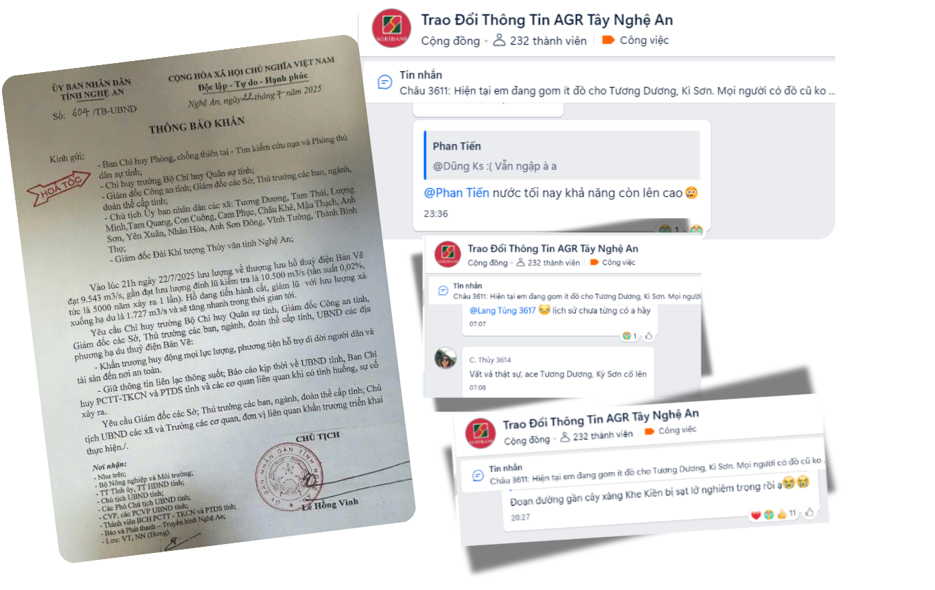 Giữa không gian tối đen xen lẫn những ánh chớp xé toạc bầu trời cùng tiếng mưa xối xả, tiếng chuông điện thoại bất ngờ vang lên. 23 giờ 20 phút. Từ nhóm chat nội bộ Agribank Chi nhánh Tây Nghệ An: “Tình hình mưa lũ diễn biến phức tạp tại Kỳ Sơn, Tương Dương, Con Cuông, nước ở sông dâng nhanh, nhiều người dân đang tiến hành sơ tán”.