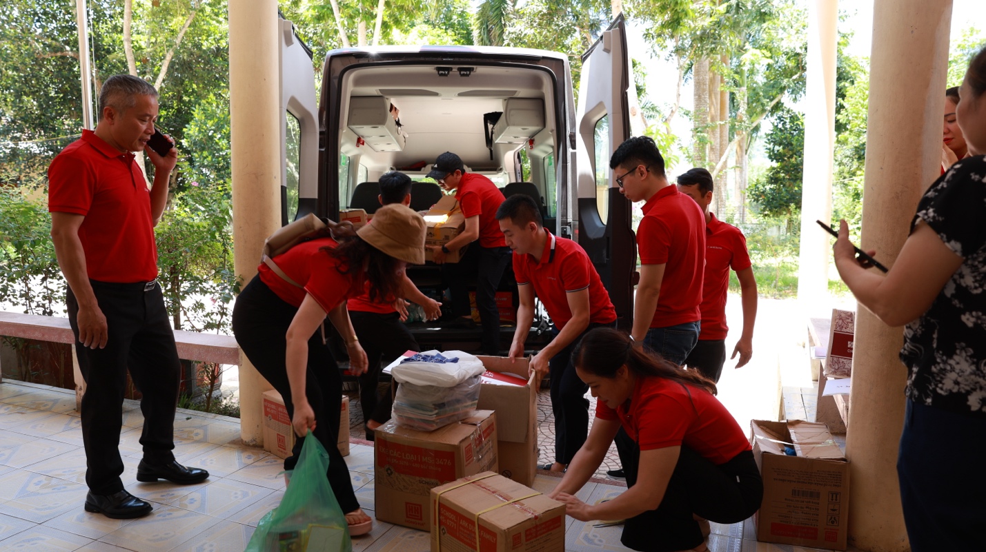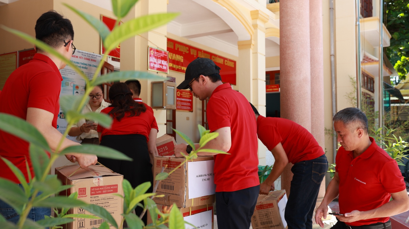 Cán bộ, đảng viên, nhân viên Agribank chuyển những thùng văn phòng phẩm, sách vở, đồ dùng học tập đến điểm tiếp nhận hỗ trợ của xã Tam Quang