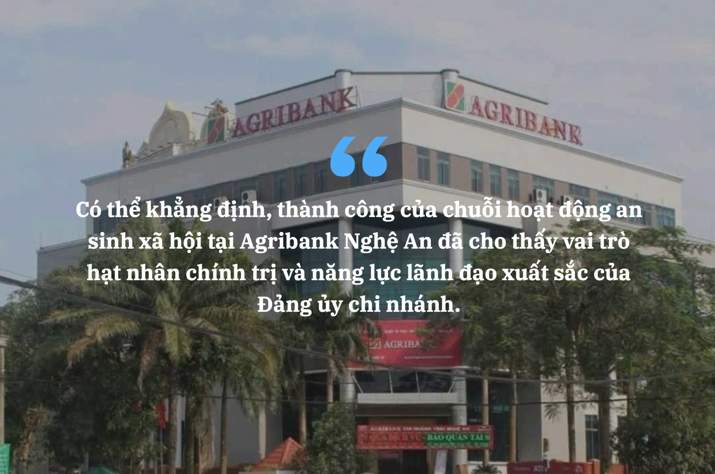 Quan điểm lãnh đạo, chỉ đạo này của Đảng ủy, Ban Giám đốc đã thấm nhuần, ăn sâu vào nếp nghĩ, cách làm của mỗi cán bộ, nhân viên Agribank trên quê hương Chủ tịch Hồ Chí Minh, trở thành nét đặc trưng, riêng có trong văn hóa doanh nghiệp của chúng tôi, đồng thời là sự cụ thể hoá, minh chứng sinh động cho bản chất ưu việt của nền kinh tế thị trường định hướng xã hội chủ nghĩa mà Đảng và Nhà nước ta đang xây dựng.