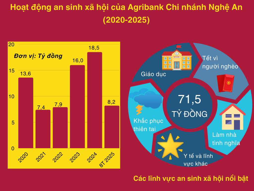 Trong nhiệm kỳ 2020-2025, từ nguồn của chi nhánh và sự hỗ trợ thêm của Agribank, Agribank Chi nhánh Nghệ An đã chung tay thực hiện công tác xã hội từ thiện với tổng kinh phí hơn 71,5 tỷ đồng. Về mục tiêu, nhiệm vụ, giải pháp chủ yếu trong nhiệm kỳ 2025-2030, Agribank Chi nhánh Nghệ An xác định tiếp tục thực hiện tốt các chương trình an sinh xã hội; tuyên truyền, vận động cán bộ, đảng viên tiếp tục phát huy tinh thần tương thân tương ái, lá lành đùm lá rách chung tay vì người nghèo, vì cộng đồng xã hội nhằm giúp đỡ về vật chất và tinh thần cho các gia đình có hoàn cảnh khó khăn, học sinh nghèo vượt khó.