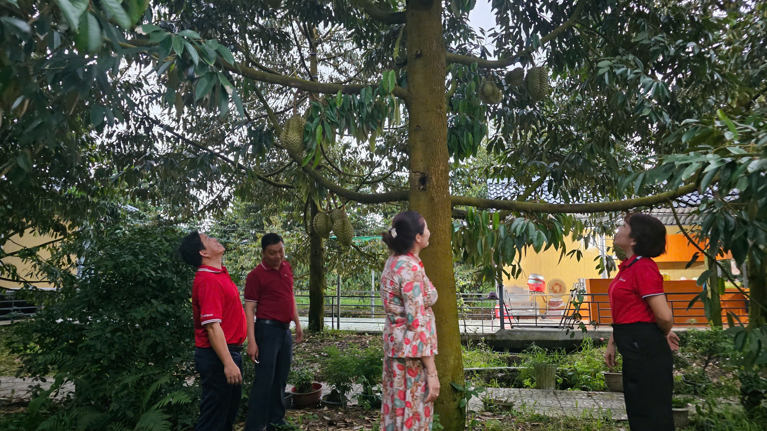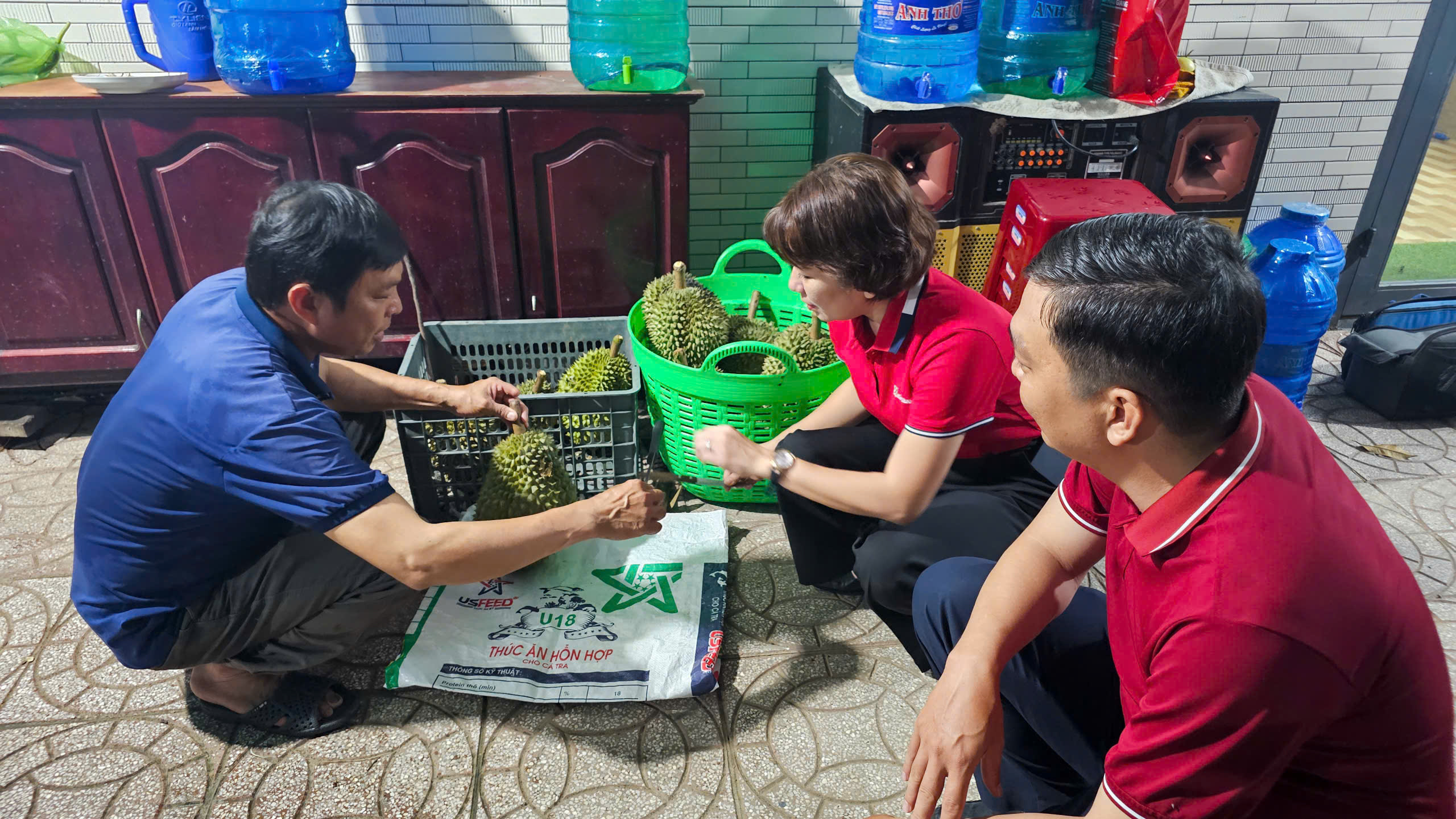 Chị Nguyễn Thị Mỹ Ý cùng cán bộ Agribank thăm vườn sầu riêng