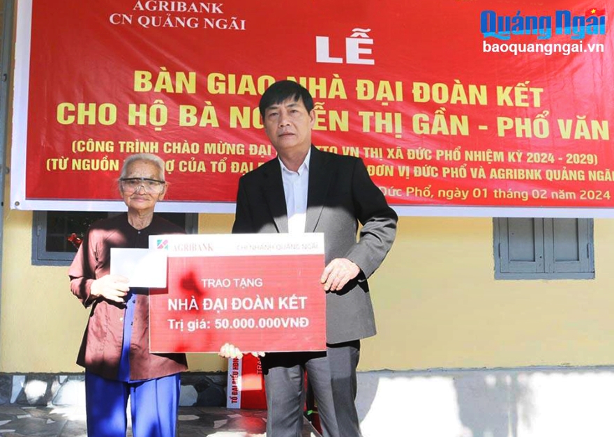 Giám đốc Agribank Quảng Ngãi Huỳnh Tấn Lực trao bảng tượng trưng tặng nhà Đại đoàn kết cho hộ Nguyễn Thị Gần, ở phường Phổ Văn (TX.Đức Phổ)