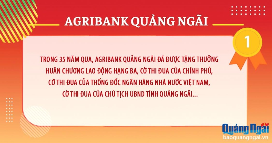 (Báo Quảng Ngãi)- Đầu tháng 7 này, Ngân hàng Nông nghiệp và Phát triển nông thôn Việt Nam - Chi nhánh tỉnh Quảng Ngãi (Agribank Quảng Ngãi) sẽ tròn 35 năm thành lập (1/7/1989 - 1/7/2024). Trong 35 năm qua, Agribank Quảng Ngãi không ngừng nỗ lực vươn lên, đóng góp quan trọng trong tiến trình phát triển kinh tế - xã hội của tỉnh.