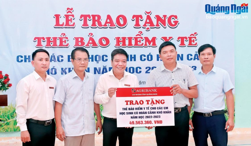 Agribank Quảng Ngãi phối hợp với Bảo hiểm xã hội tỉnh hỗ trợ thẻ bảo hiểm y tế cho học sinh có hoàn cảnh khó khăn. Ảnh: AQN