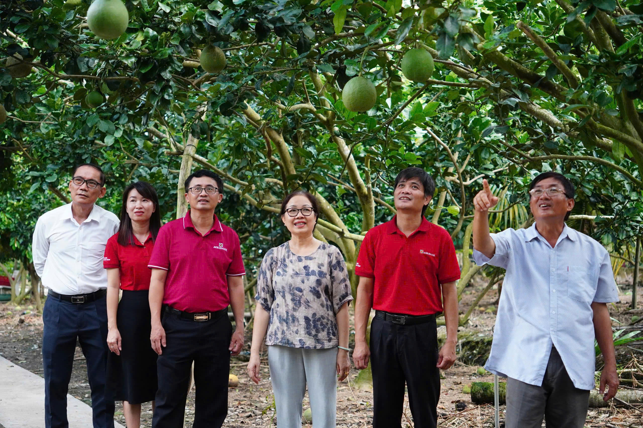 Ông Dương Thái Hoàng (bìa phải) cùng cán bộ Agribank tham quan vườn trái cây của gia đình