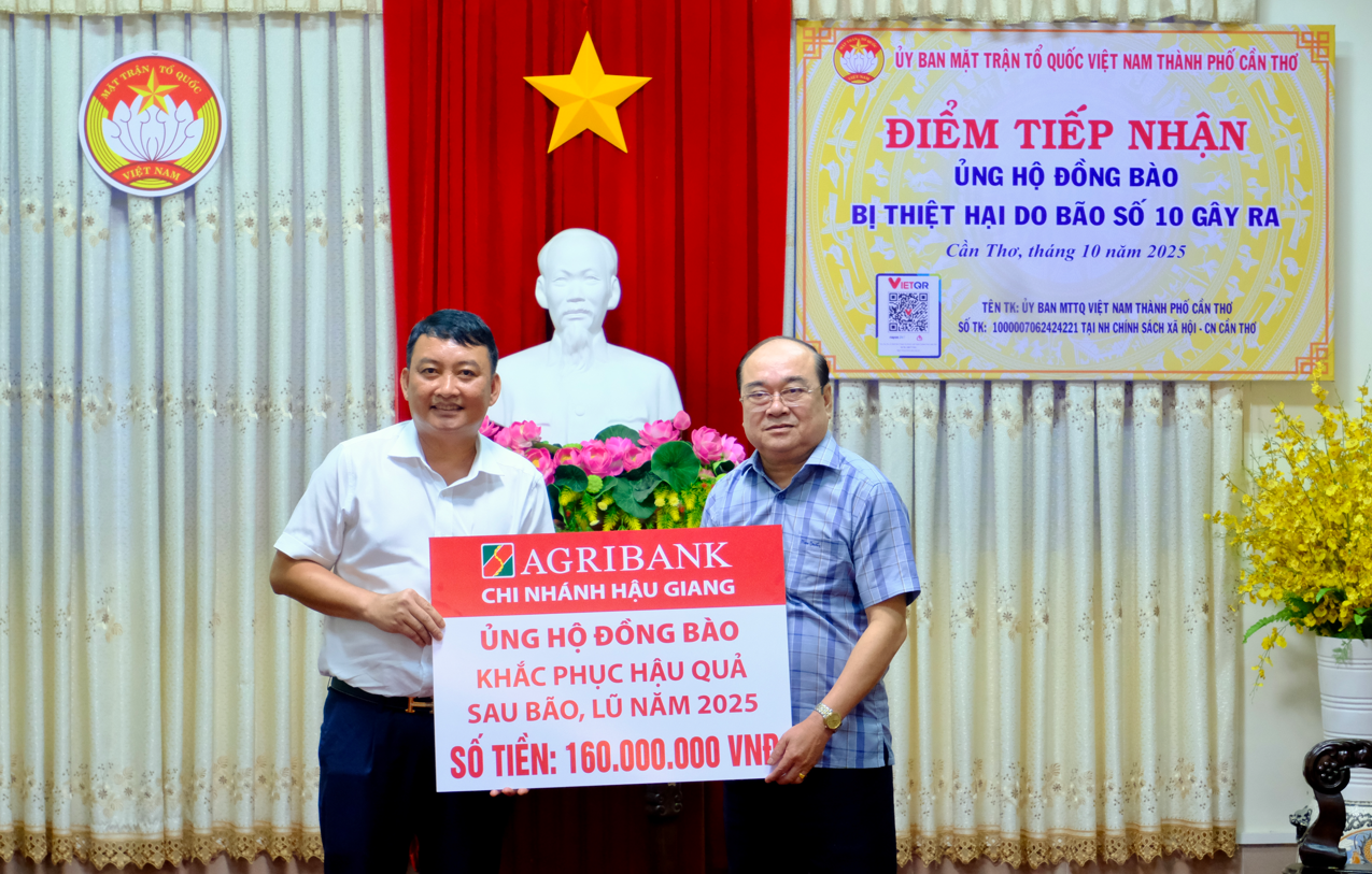 Sáng ngày 23/10/2025, tại Ủy ban Mặt trận Tổ quốc Việt Nam thành phố Cần Thơ, đại diện đoàn công tác Agribank Chi nhánh Hậu Giang do ông Lê Hoàng Minh - Phó Giám đốc Chi nhánh làm trưởng đoàn đã trực tiếp trao 160 triệu đồng quyên góp tới Ủy ban Mặt trận Tổ quốc Việt Nam thành phố Cần Thơ.