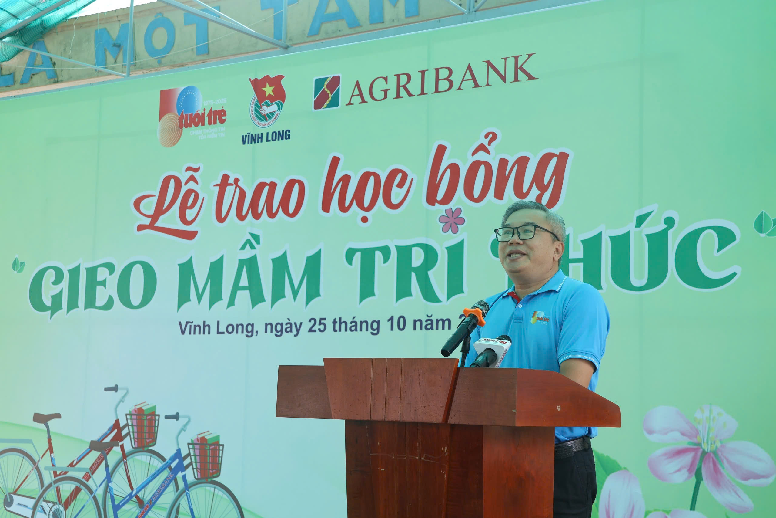 Phát biểu tại buổi lễ, ông Phạm Văn Hóa, Phó Giám đốc Agribank Chi nhánh Phú Nhuận, chia sẻ: Đồng hành cùng Chương trình “Gieo mầm tri thức” năm nay, chúng tôi dành 800 suất học bổng trao tặng cho các em học sinh có hoàn cảnh khó khăn tại tỉnh Đồng Tháp, tỉnh Vĩnh Long. Và sắp tới là 2 tỉnh Thanh Hóa và Tây Ninh. Mong muốn của Agribank là cùng Báo Tuổi Trẻ mang đến cho các em những điều tốt đẹp nhất. Mong rằng những chiếc xe đạp được trao tặng sẽ giúp các em bớt vất vả hơn khi đến trường. Quan trọng hơn là các em sẽ thấy được tương lai phía trước rất tươi đẹp. Agribank Chi nhánh Phú Nhuận sẽ tiếp tục đồng hành cùng với Báo Tuổi Trẻ với phương châm ở đâu có học sinh nghèo, khó khăn, ở đó sẽ có chương trình học bổng “Gieo mầm tri thức”.