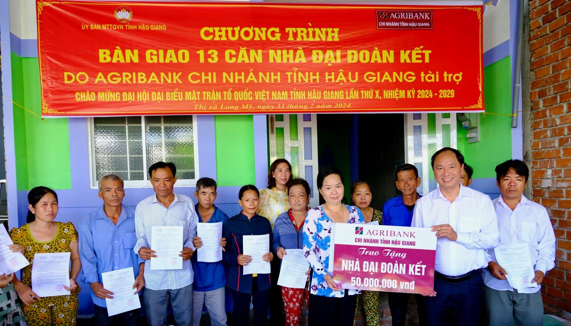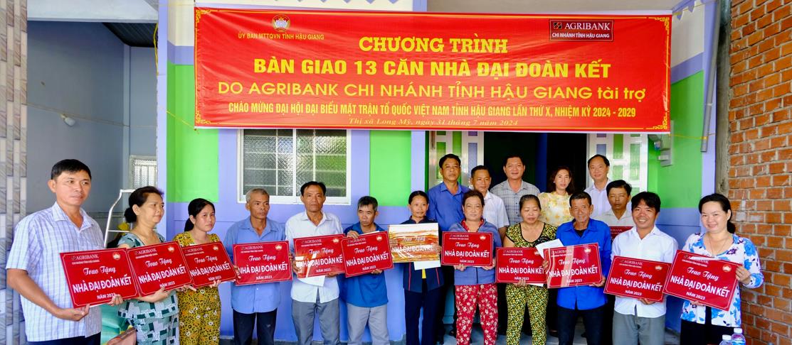 Sáng ngày 31/7/2024, Ngân hàng Nông nghiệp và Phát triển Nông thôn Việt Nam - Chi nhánh tỉnh Hậu Giang (Agribank Hậu Giang) phối hợp với Ban thường trực Ủy ban Mặt trận Tổ quốc Việt Nam thị xã Long Mỹ tổ chức lễ bàn giao nhà Đại đoàn kết cho 13 hộ dân có hoàn cảnh khó khăn, nhà ở tạm bợ.