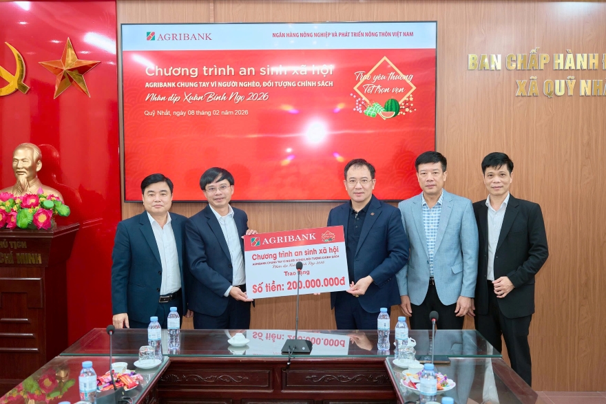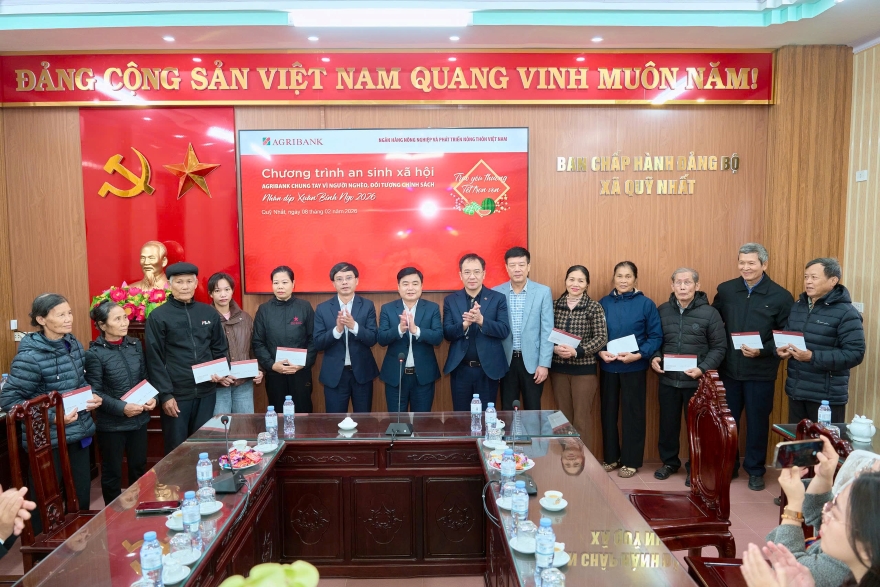 Hưởng ứng phong trào Chung tay vì người nghèo, đối tượng chính sách và tiếp tục hành trình sẻ chia “Trao yêu thương - Tết trọn vẹn” nhân dịp Tết Nguyên đán Bính Ngọ 2026, ngày 8/2/2026, Agribank đã trao tặng 400 phần quà Tết tới các hộ gia đình có hoàn cảnh khó khăn tại xã Quỹ Nhất, tỉnh Ninh Bình.