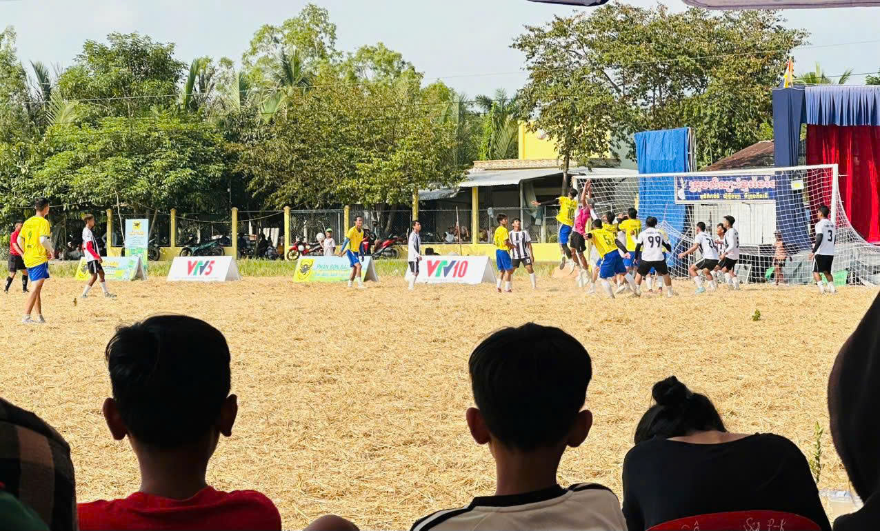 Điểm đặc biệt của Giải bóng đá nông dân Khmer khu vực ĐBSCL chính là “sân bóng giữa ruộng”. Gọi là sân bóng, nhưng thật ra là tận dụng mặt bằng từ cánh đồng sau mùa thu hoạch - để các đội giao lưu thể thao những lúc nông nhàn. Không khán đài kiên cố, không mặt cỏ tiêu chuẩn, chỉ là những đường kẻ đơn sơ và hai bên bờ ruộng ken kín người xem, nhưng chính sự mộc mạc ấy lại tạo nên sức hút riêng. Tiếng reo hò, tiếng trống, tiếng gọi nhau í ới hòa quyện, biến nơi đây thành một “chảo lửa” đúng nghĩa giữa miền quê.