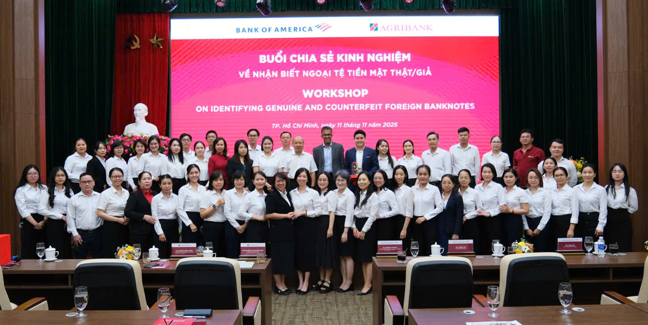 Trong bối cảnh tình hình lưu hành ngoại tệ giả trên thế giới có xu hướng gia tăng, đặc biệt tại khu vực châu Á - Thái Bình Dương, việc nâng cao kỹ năng nhận biết và xử lý ngoại tệ thật/giả trở thành yêu cầu cấp thiết đối với các ngân hàng thương mại. Nhằm tăng cường năng lực nghiệp vụ và bảo đảm an toàn kho quỹ, Ngân hàng Nông nghiệp và Phát triển nông thôn Việt Nam (Agribank) phối hợp với Ngân hàng Bank of America (Bank of America) tổ chức hai buổi chia sẻ kinh nghiệm chuyên sâu về nhận biết ngoại tệ mặt thật/giả dành cho đội ngũ cán bộ nghiệp vụ, diễn ra tại TP. Hồ Chí Minh ngày 11/11/2025 và tại Hà Nội ngày 12/11/2025.