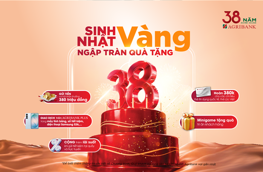 Nhân dịp kỷ niệm 38 năm thành lập, Ngân hàng Nông nghiệp và Phát triển nông thôn Việt Nam (Agribank) tổ chức chuỗi chương trình khuyến mại quy mô lớn trên toàn quốc, với nhiều ưu đãi hấp dẫn, như một lời tri ân chân thành gửi tới hàng triệu khách hàng đã tin tưởng và đồng hành cùng Agribank trong suốt hành trình phát triển.