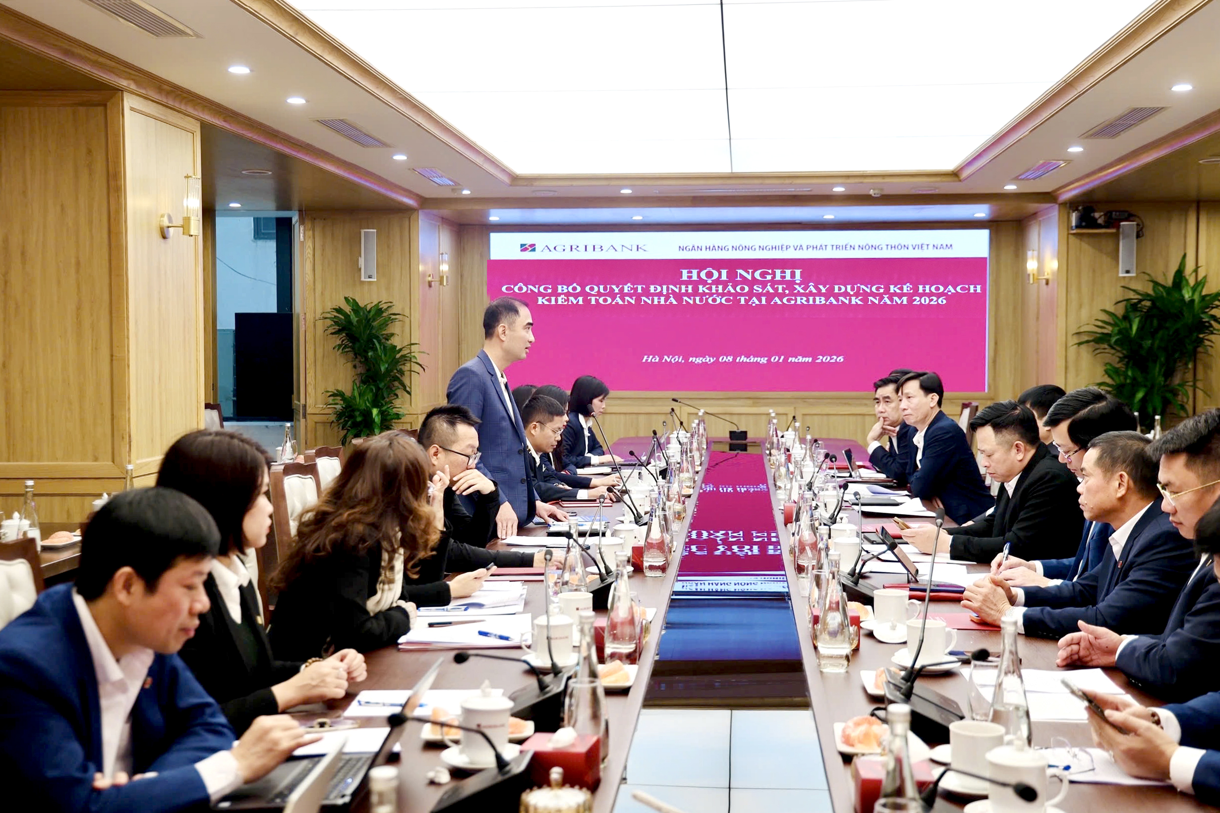 Sáng ngày 08/01/2026, tại Trụ sở chính Agribank - số 02 Láng Hạ, Đoàn công tác Kiểm toán Nhà nước đã làm việc với Agribank để khảo sát, thu thập thông tin về tình hình hoạt động năm 2025, phục vụ xây dựng kế hoạch kiểm toán năm 2026. Trọng tâm là kiểm toán Đề án cơ cấu lại gắn với xử lý nợ xấu giai đoạn (2021-2025) - giai đoạn Agribank đã có dấu ấn đột phá hoàn thành toàn diện, xuất sắc các mục tiêu Đề án, kết thúc giai đoạn cơ cấu lại theo yêu cầu của Chính phủ, NHNN, tạo dựng đủ thế và lực, tự tin bước sang giai đoạn phát triển mới.