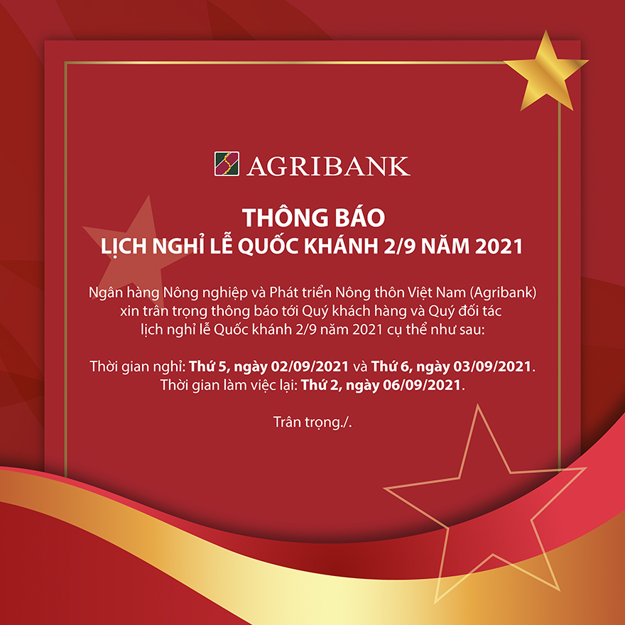 Ngân hàng Nông nghiệp và Phát triển nông thôn Việt nam (AGRIBANK) xin trân trọng thông báo đến Quý Khách hàng và Quý Đối tác lịch nghỉ lễ Quốc khánh 2/9 như sau: