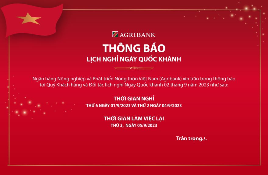 Ngân hàng Nông nghiệp và Phát triển Nông thôn Việt Nam (Agribank) xin trân trọng thông báo đến Quý Khách hàng và Quý Đối tác lịch nghỉ lễ Quốc Khánh năm 2023: