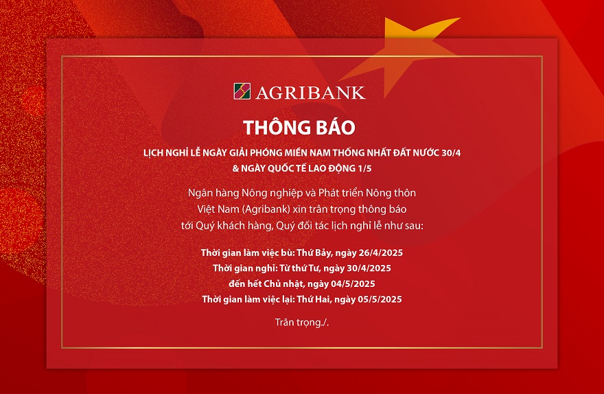 Ngân hàng Nông nghiệp và Phát triển Nông thôn Việt Nam (Agribank) xin trân trọng thông báo đến Quý Khách hàng và Quý Đối tác lịch nghỉ lễ 30/4 và 1/5 năm 2025: