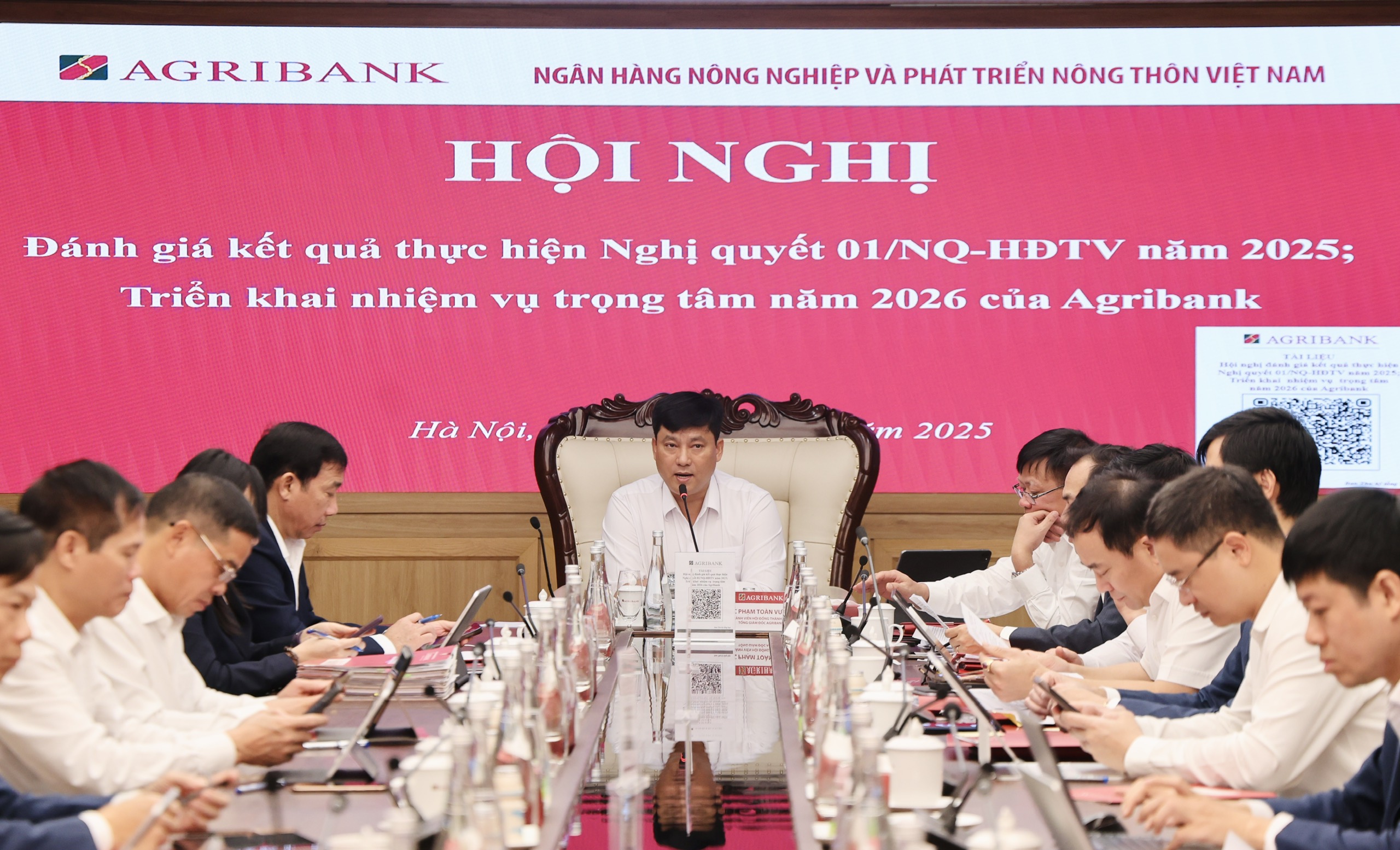 Trên cơ sở tinh thần thống nhất cao của Hội nghị, phát biểu kết luận, đồng chí Phạm Toàn Vượng - Tổng Giám đốc Agribank ghi nhận và đánh giá cao những nỗ lực bền bỉ, đồng bộ của toàn hệ thống trong năm 2025, đặc biệt là việc tổ chức triển khai hiệu quả Nghị quyết số 01/NQ-HĐTV của Hội đồng thành viên. Tổng Giám đốc nhấn mạnh, những ngày cuối tháng 12 là thời điểm chuyển giao sang năm 2026 - năm bản lề mở đầu việc triển khai các nghị quyết Đại hội Đảng bộ các cấp, cùng các nghị quyết, kết luận của Trung ương và định hướng, giải pháp điều hành của Chính phủ đối với ngành Ngân hàng giai đoạn 2026-2030. Trong bối cảnh đó, ngành Ngân hàng nói chung và Agribank nói riêng đứng trước yêu cầu chuyển mình mạnh mẽ hơn trong tái cơ cấu hệ thống, đẩy nhanh chuyển đổi số, nâng cao năng lực quản trị rủi ro, bảo đảm an toàn, hiệu quả và chủ động thích ứng với tiến trình hội nhập quốc tế ngày càng sâu rộng. Đây cũng là thời điểm cần khẩn trương chuẩn bị và triển khai các nhiệm vụ trọng tâm, cấp thiết của năm 2026, bảo đảm tính liên thông, kế thừa và chủ động trong công tác điều hành.