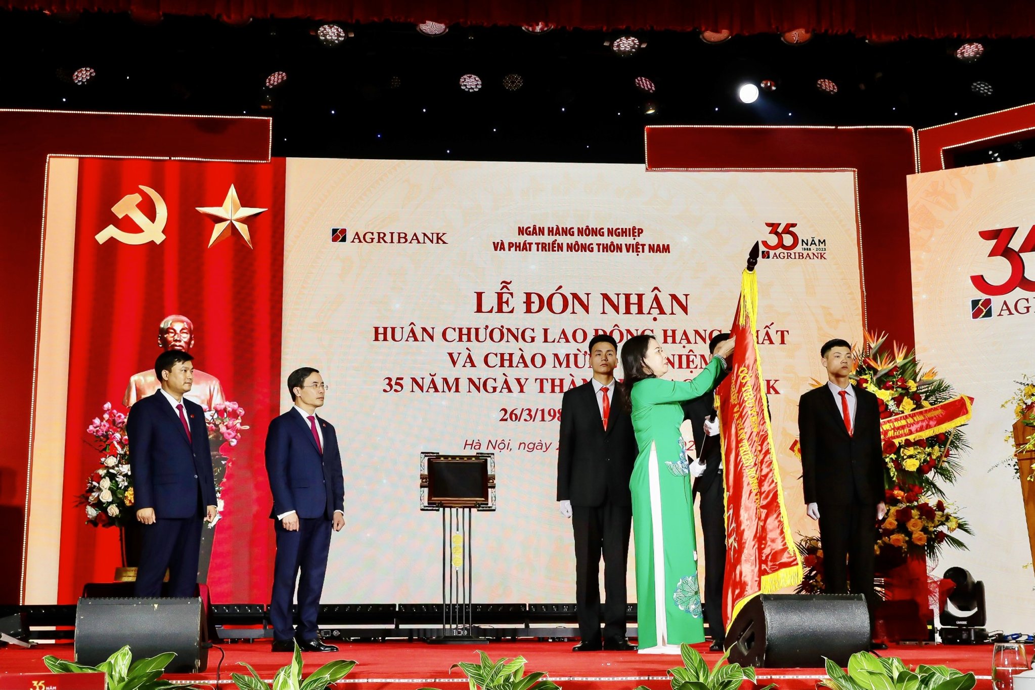 Tiếp tục ghi nhận những đóng góp quan trọng của Agribank trong quá trình 35 năm phát triển, Chủ tịch Nước CHXHCN Việt Nam đã tặng thưởng Agribank Huân chương Lao động hạng Nhất. Thay mặt Đảng và Nhà nước, Đồng chí Phó Chủ tịch nước Võ Thị Ánh Xuân gắn Huân chương Lao động hạng Nhất lên Lá cờ truyền thống của Agribank.