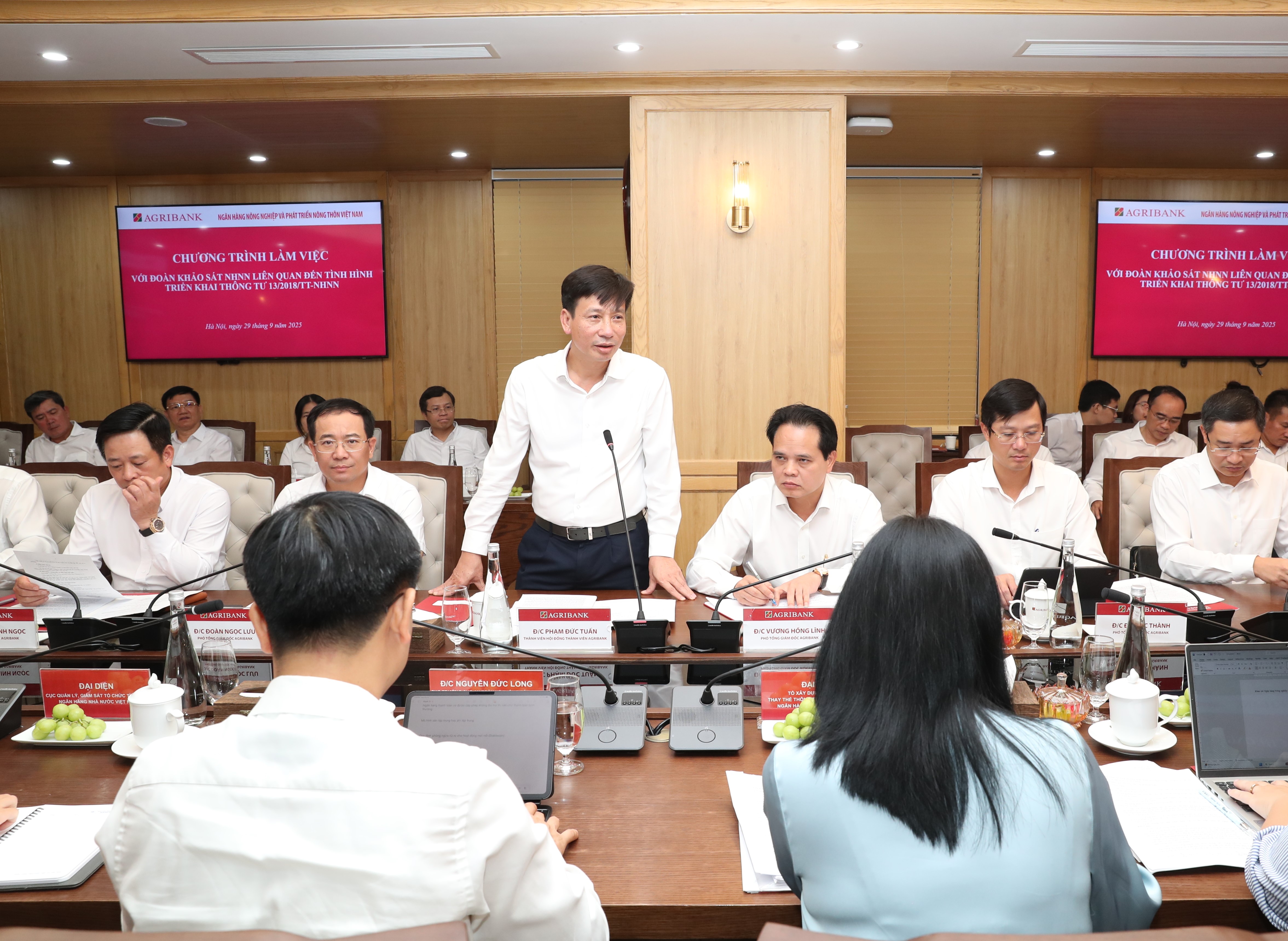 Phát biểu tại chương trình làm việc, đồng chí Nguyễn Đức Long - Cục trưởng Cục An toàn hệ thống các Tổ chức tín dụng, Trưởng đoàn khảo sát nhấn mạnh: Agribank là ngân hàng lớn trong nhóm Big4, có quy mô hoạt động và hệ thống chi nhánh rộng khắp, do đó việc rà soát thực tiễn triển khai Thông tư 13 tại Agribank có ý nghĩa quan trọng. Đây là cơ sở để NHNN tổng hợp, đánh giá và đưa ra các định hướng, hướng dẫn mới, trong đó có nội dung về quản trị rủi ro mô hình, cập nhật phương pháp đánh giá và điều chỉnh phù hợp với thực tế hoạt động ngân hàng.