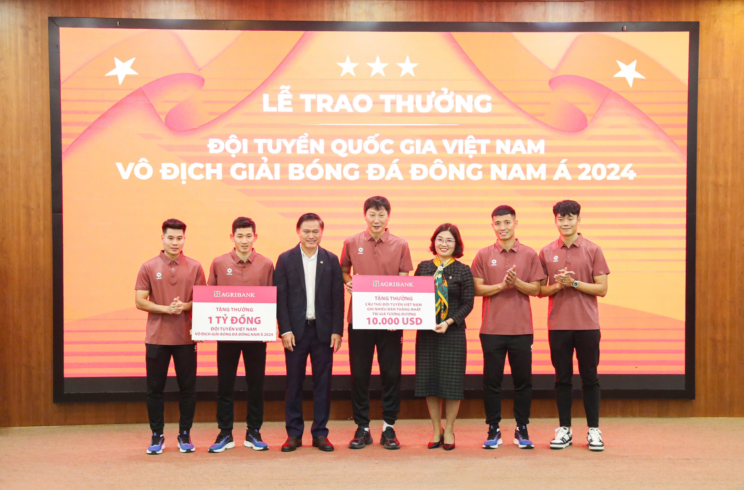 Sáng nay 08/01/2025, Ngân hàng Nông nghiệp và Phát triển Nông thôn Việt Nam (Agribank) đã trao thưởng 1 tỷ đồng cho Đội tuyển bóng đá nam Quốc gia Việt Nam và cầu thủ ghi nhiều bàn thắng nhất Nguyễn Xuân Son với trị giá giải thưởng tương đương 10.000 USD. Đại diện Agribank cho biết, đây là phần thưởng xứng đáng cho sự nỗ lực, lòng quyết tâm, tinh thần thi đấu quả cảm của đội tuyển tại giải đấu. Bên cạnh việc chúc mừng đội tuyển, Agribank cũng chia sẻ với chấn thương của cầu thủ Nguyễn Xuân Son.