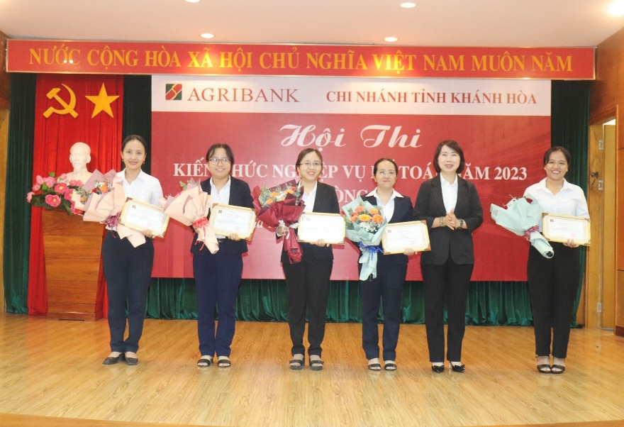 Bà Lâm Thị Hồng – Phó Giám đốc Agribank Chi nhánh tỉnh Khánh trao giải cho các giao dịch viên đạt thành tích cao trong Hội thi