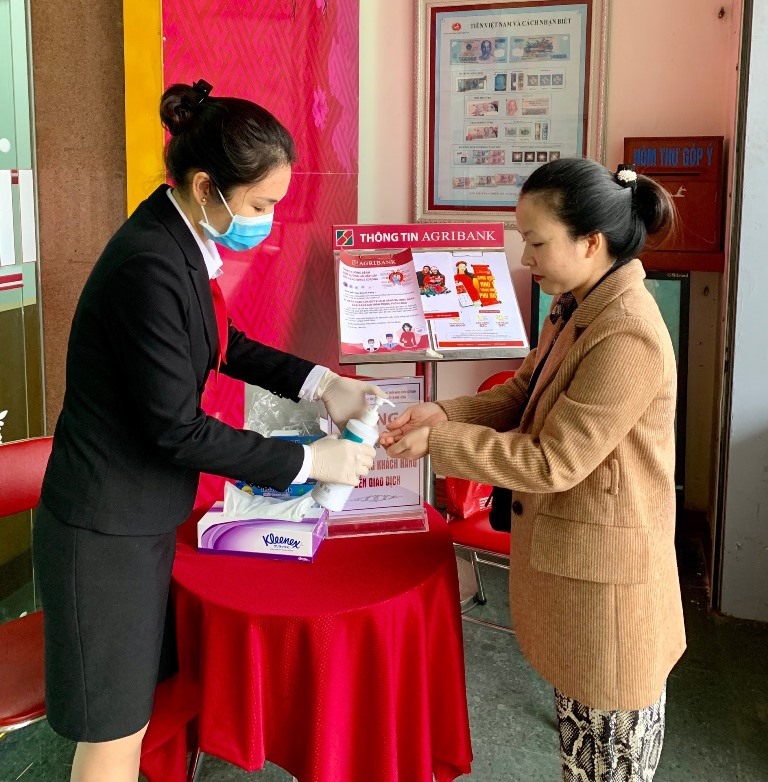 Agribank giúp khách hàng sát khuẩn khi giao dịch tại ngân hàng