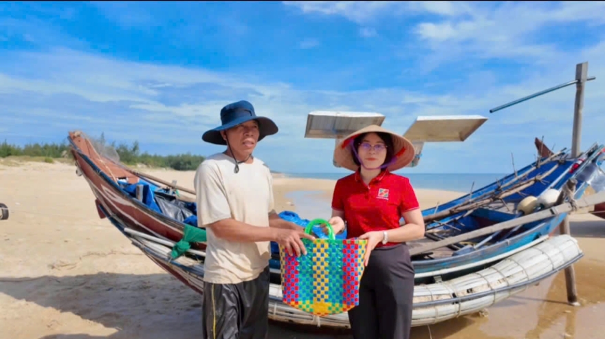 Chị Nguyễn Thị Kim Hưng - Phó Giám đốc, Chủ tịch CĐCSTV Agribank Chi nhánh Triệu Phong, Quảng Trị trao tặng giỏ đi chợ cho ngư dân trên bờ biển Nhật Tân thuộc xã Triệu Cơ, tỉnh Quảng Trị. Ảnh: TH