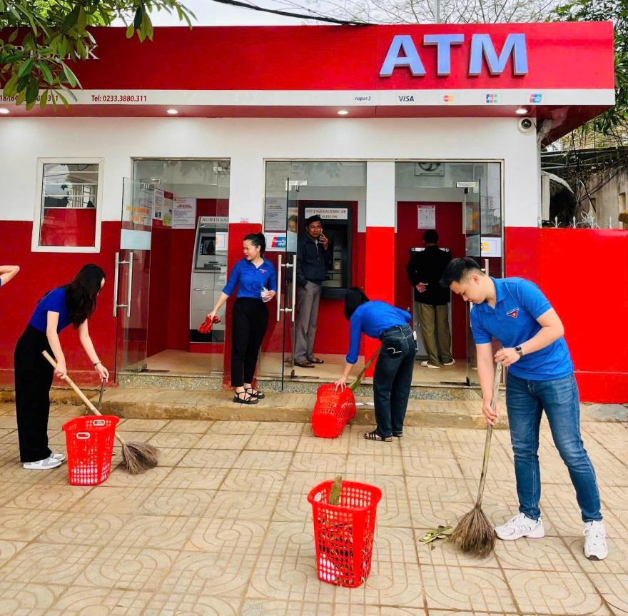 Đoàn viên Chi đoàn Agribank Hướng Hóa, Quảng Trị dọn dẹp vệ sinh khuôn viên trụ sở làm việc và cabin ATM. Ảnh: TH