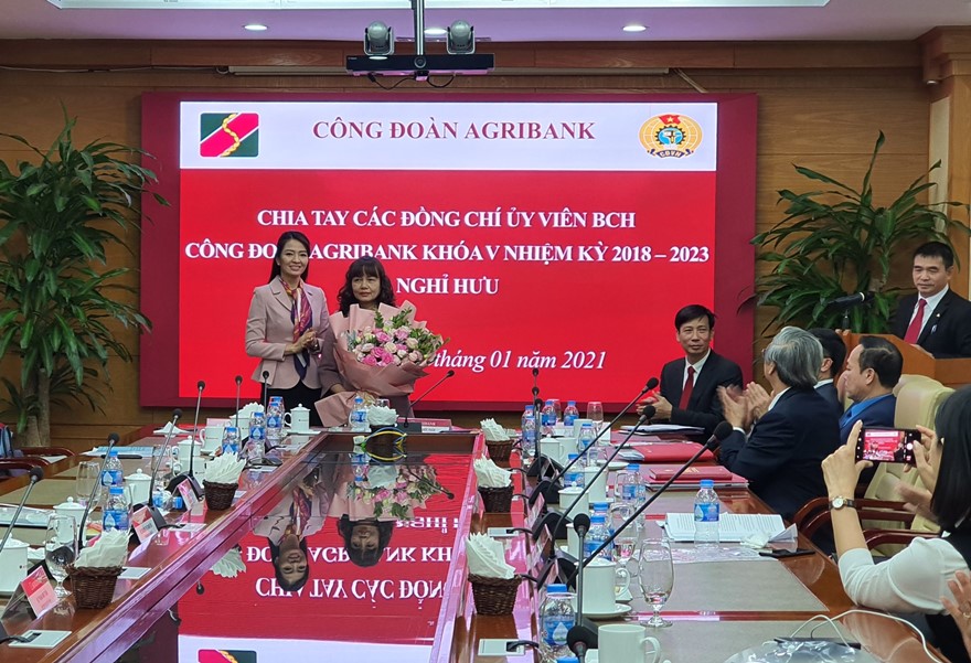 Đồng chí Nguyễn Khánh Chi, Phó Chủ tịch Công đoàn Ngân hàng Việt Nam tặng hoa đồng chí không tham gia Ban chấp hành Công đoàn Agribank khóa V, về nghỉ chế độ